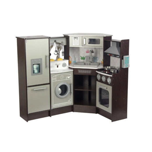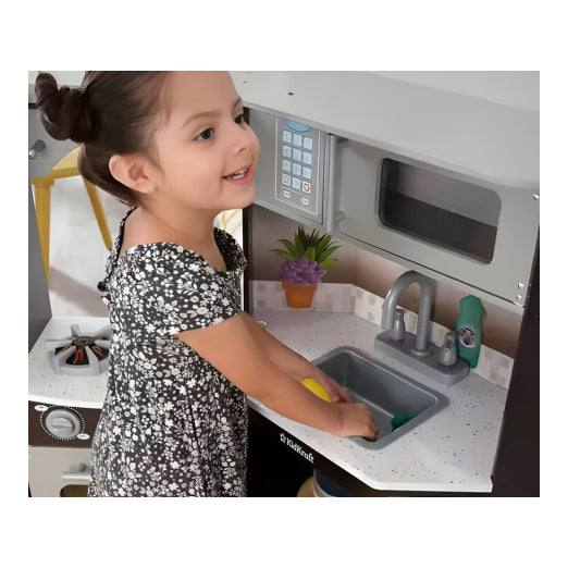 مطبخ خشبي للأطفال ذوي تصميم واقعي يشجع اللعب والإبداع الخيالي. إنه يتميز بفرن وموقد وحوض وأرفف التخزين وأدوات المطبخ التفاعلية. مصنوعة من مواد آمنة ودائمة ، مما يجعلها خيارًا مثاليًا لتطوير مهارات الأطفال والاجتماعية أثناء اللعب.