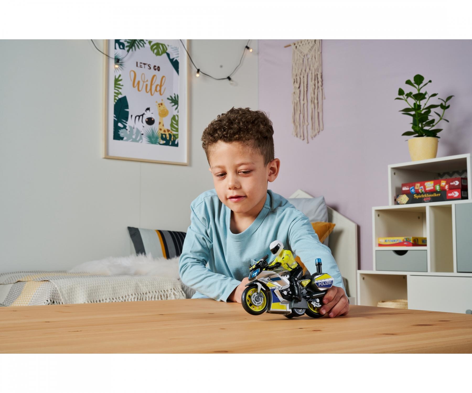دراجة شرطة Dickie Toys هي دراجة نارية 17 سم مصممة للأطفال الذين تتراوح أعمارهم بين 3 سنوات وما فوق. على غرار دراجة نارية في شرطة ياماها ، فإنه يتميز بشخصية قابلة للإزالة للشرطة بأطراف متحركة ، مما يتيح لعب الأدوار التفاعلية. مجهزة بمحرك احتكاك ، تدفع الدراجة إلى الأمام عند دفعها ، وتعزيز تجربة اللعب. تشمل الميزات الإضافية ضوءًا أزرقًا وصفارات الإنذار ، يتم تنشيطه بواسطة زر الضغط ، مما يوفر سيناريوهات استجابة للطوارئ واقعية. تتضمن اللعبة أيضًا عجلات دعم خفية تعمل كحامل ، مما يضمن الاستقرار أثناء اللعب. يتم تضمين البطاريات (2x AAA) لتشغيل المؤثرات الضوئية والصوتية