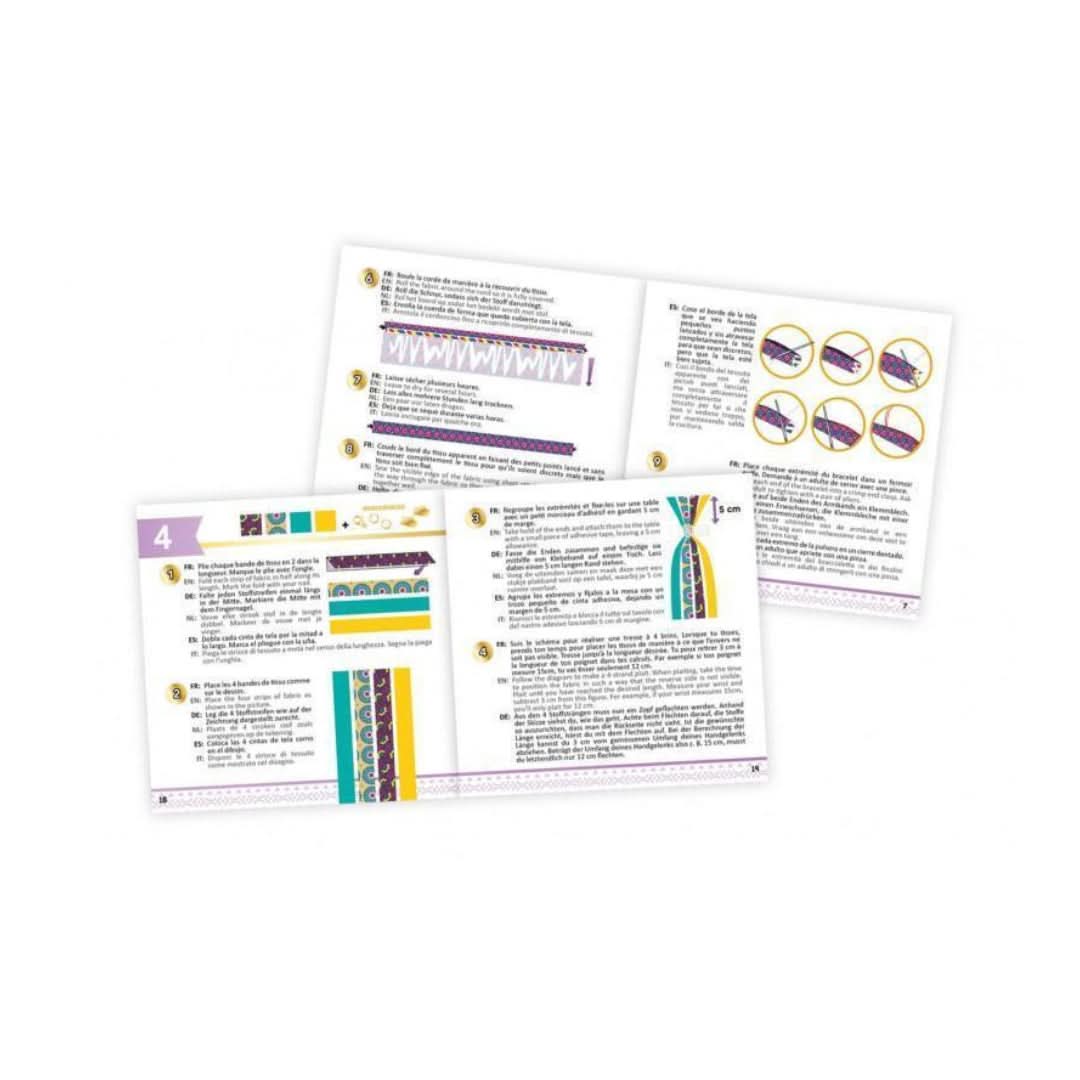 "اصنع 4 مجوهرات من النسيج مع الزخارف الشمعية! زر ، جديلة ، عصا وخياطة الملحقات لإنشاء مجوهرات الورك. ألوان تعليمات مصورة للاستخدام. مناسبة للأطفال من 8