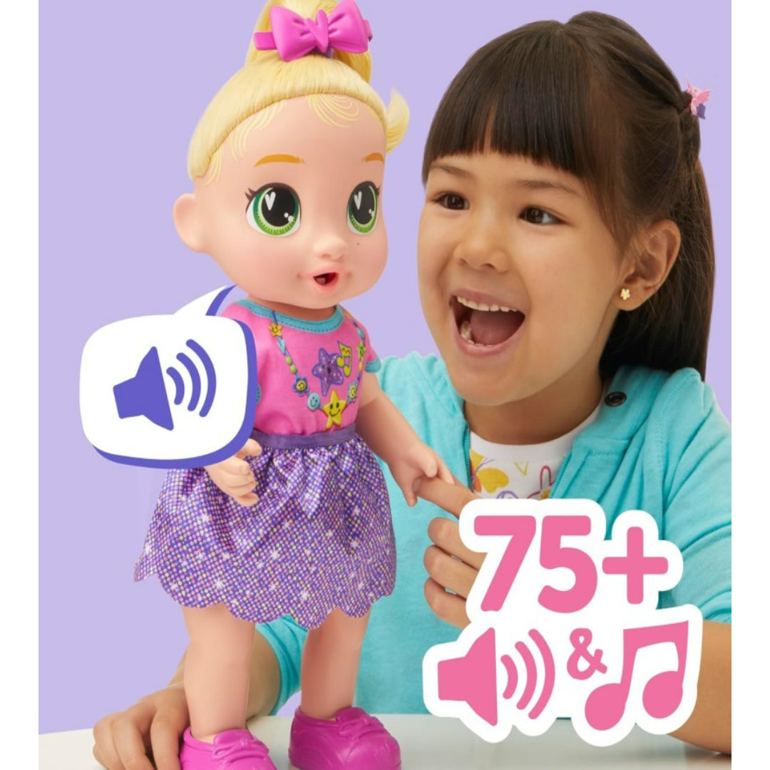 - أكثر من 75 أصواتًا وعبارات يجب تشغيلها: تتقدم الدمية وأنت تلعب معها ، من البداية إلى كلماتها الأولى. (الدمية تتحدث باللغة الإنجليزية والإسبانية فقط)