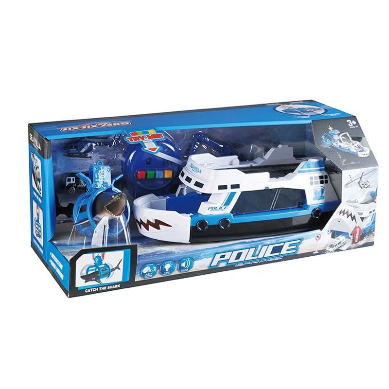 قارب صيد مجهز بوظائف الصوت والضوء هو اقتراح للأطفال من سن 3 سنوات. يحتوي القارب على طابقين، في الجزء السفلي والخلفي والأمامي هناك شريحة زنبركية. على جانب القارب يوجد سمكة قرش، بما في ذلك سمكة القرش. برج القارب مزود بلوحة صوت وضوء مع أربعة أجهزة إنذار للشرطة وأضواء وامضة. يحتوي القارب على مقبض حمل مناسب. هناك عجلات في الجزء السفلي من القارب. يتم تشغيل اللعبة بواسطة 3 بطاريات AG13 متضمنة في المجموعة.