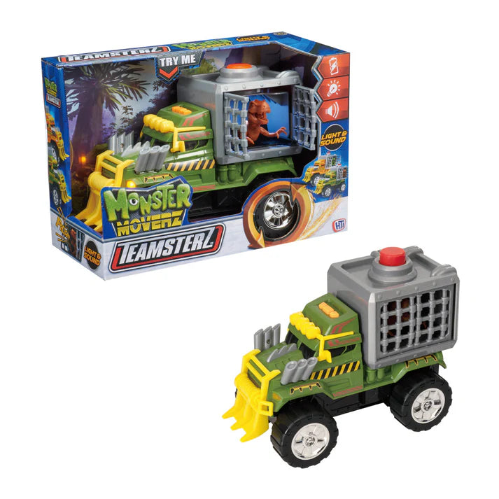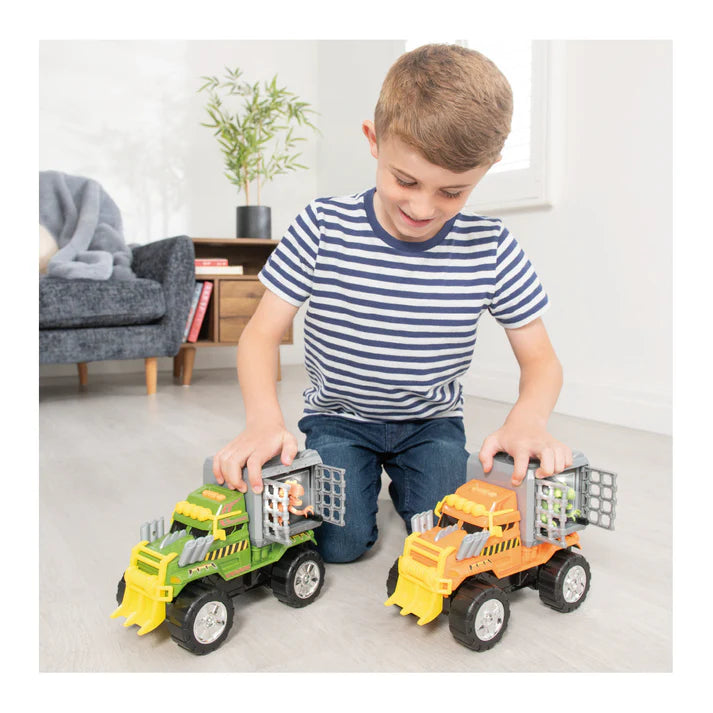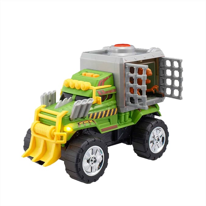 تتسارع سيارة Teamsterz Moverz Dino Dino المليئة بالحركة Monster Doverz Dino إلى العمل عند الضغط على زر! هذه الشاحنة تنقل البضائع المخيفة ولكن حذار - تحاول الشحنة التحرر. اضغط على الزر الأحمر الكبير لرؤية الديناصور يخرج ويضيء. استمع إلى المحرك أثناء هديره إلى الحياة ، ثم شاهده وهو يتقدم إلى الأمام مع قفص القفص. اضغط على الأزرار الأخرى لتنشيط الأضواء وأصوات الديناصورات. الهدية المثالية لأي سائق صغير متحمس ، يوفر Teamsterz Monster Moverz Dino Escape ساعات من المرح الخيالي! مناسبة لأعمار 3 سنوات +.