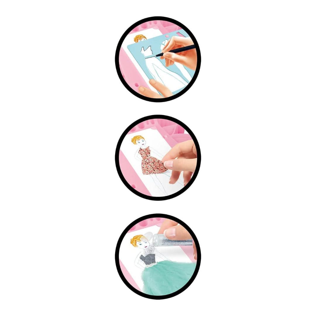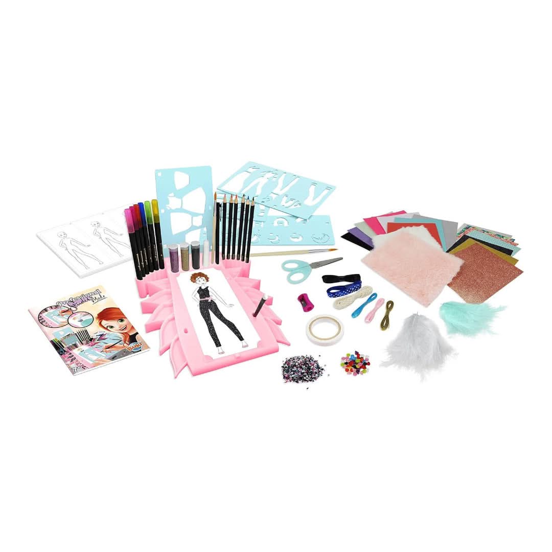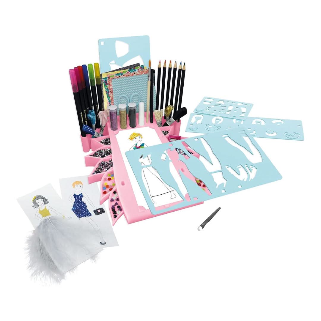 FASHION DESIGNER KIT – A lot of original accessories to design trendy outfits: 1 design studio, 4 stencils, self-adhesive fabrics (cotton, fur, glitter, imitation leather…), double-ended felt-tip pens, watercolour pencils, glitters, feathers, ribbons…