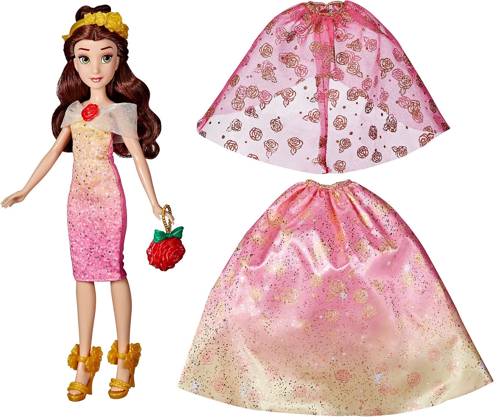 This Princess Life Belle doll comes with 7 gold and pink fashion doll accessories inspired by her look in the animated film. Most pieces can be worn multiple ways to create more than 10 glamorous outfit combinations, giving kids the chance to explore their fashion designer side. This set includes a removable double-sided dress, 2 skirts, tiara, rose accessory, purse, and a pair of shoes. How many different styles can your Disney Princess fan create?