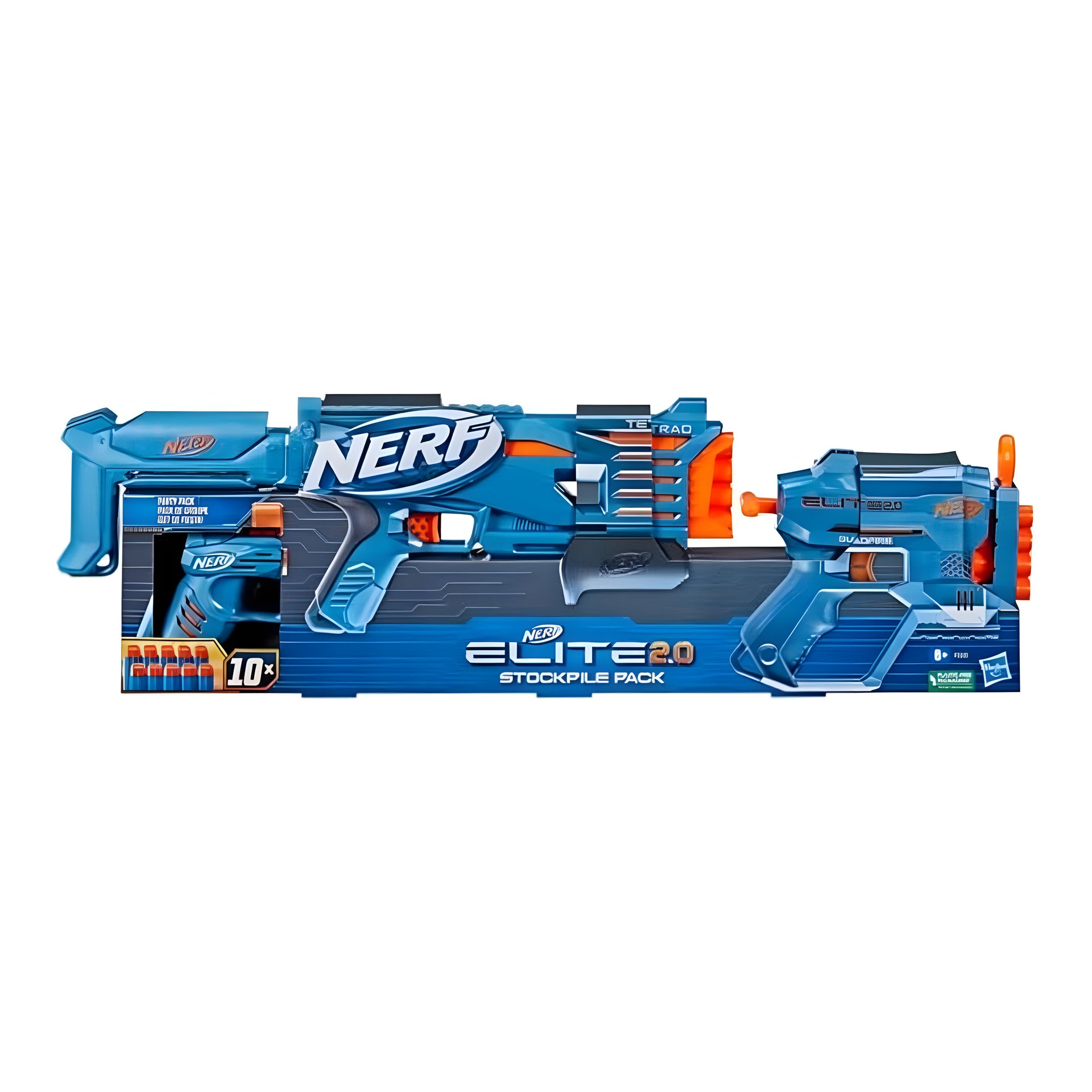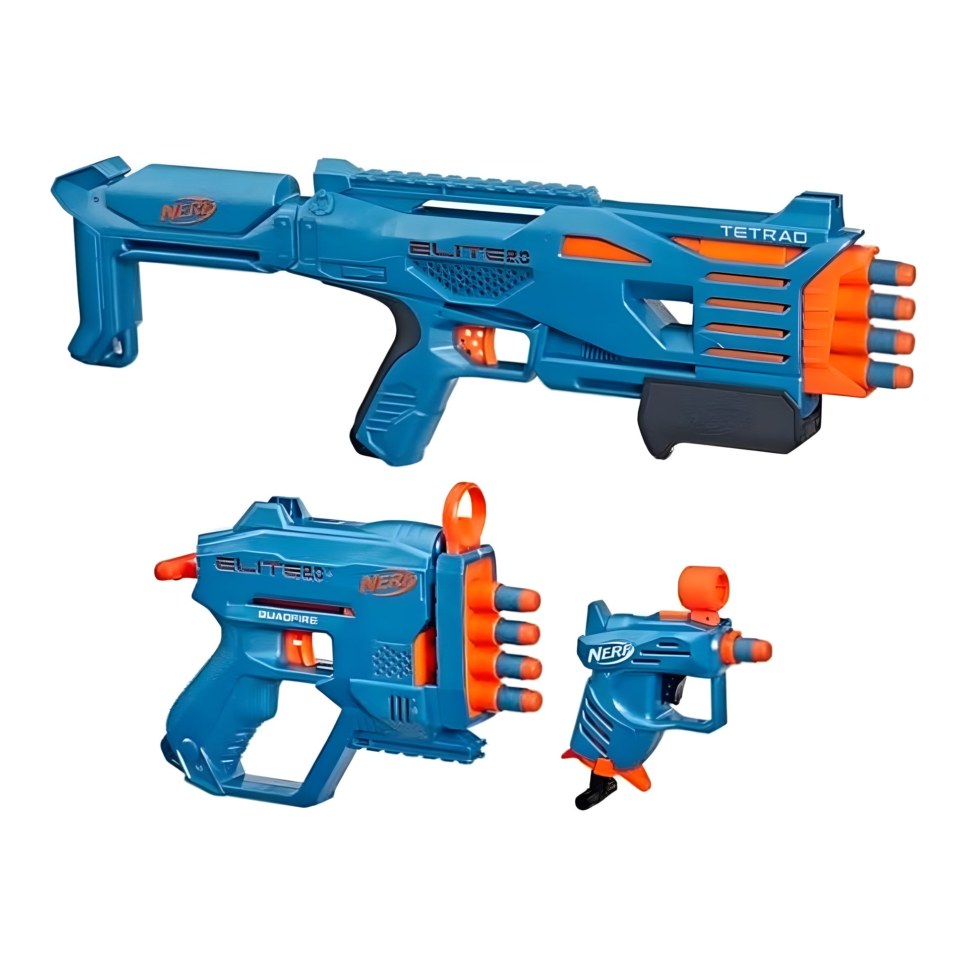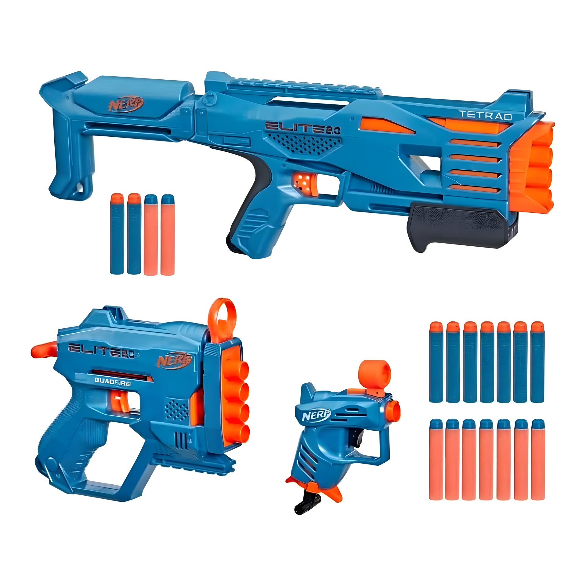 This Nerf Elite 2.0 set includes 3 blasters for lots of dart-firing fun! They're easy to use, so if you're new to Nerf battling, these blasters will have you ready to go in a few quick steps. And if you're already a Nerf fan, this is a great addition to your Nerf blaster collection. The Tetrad QS-4 blaster features 4-dart blasting, unleashes 4 darts in a row, and has a targeting sight and pull-back priming handle. The Quadfire QS-4 blaster has 4-dart capacity to unleash 4 darts in a row, a pull-back priming handle, and a targeting sight for aiming