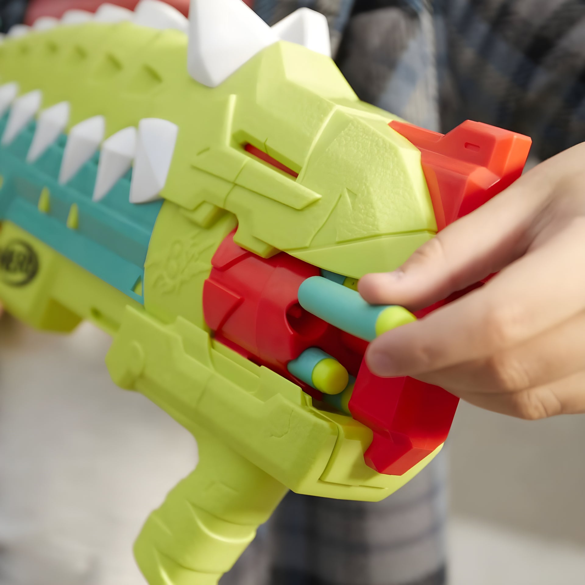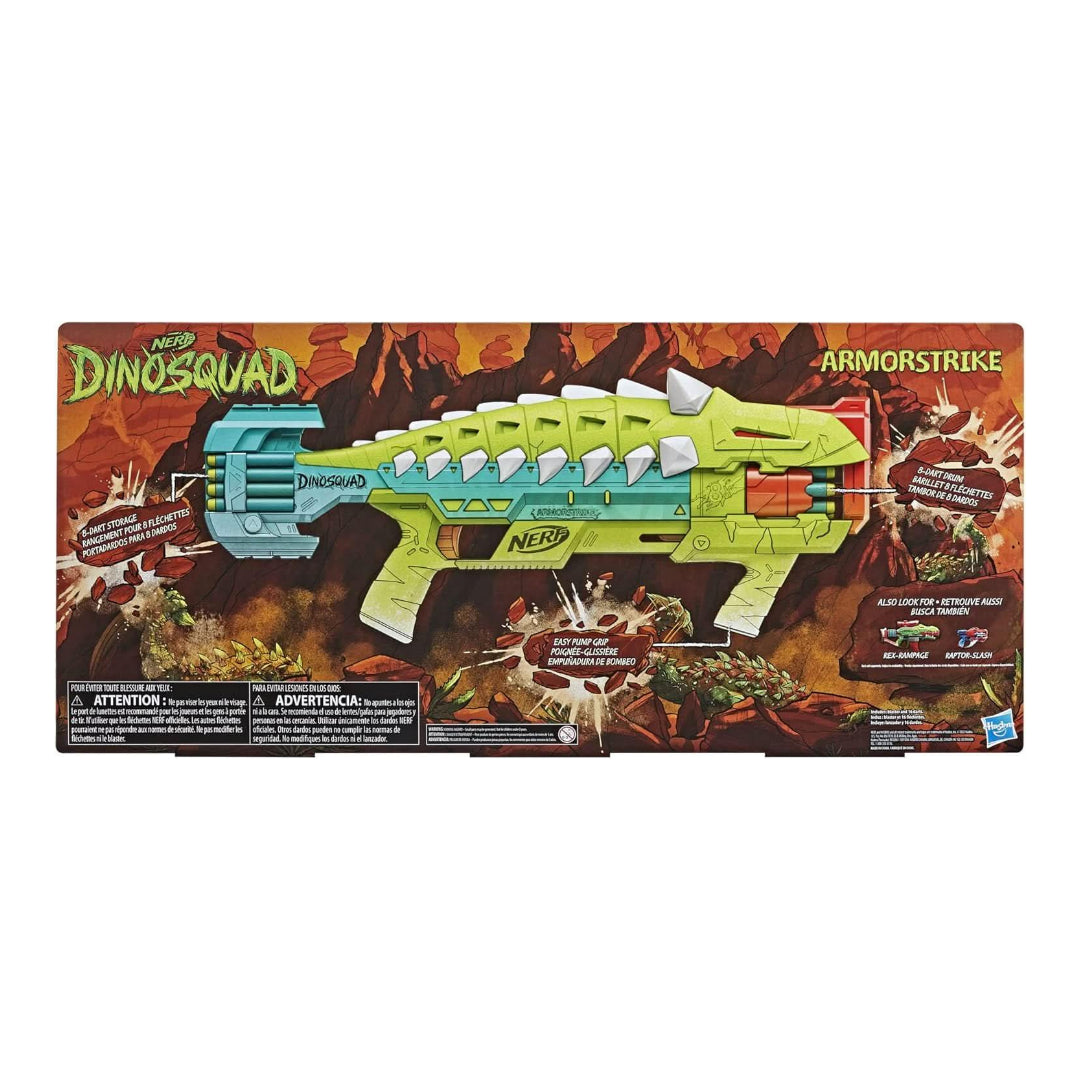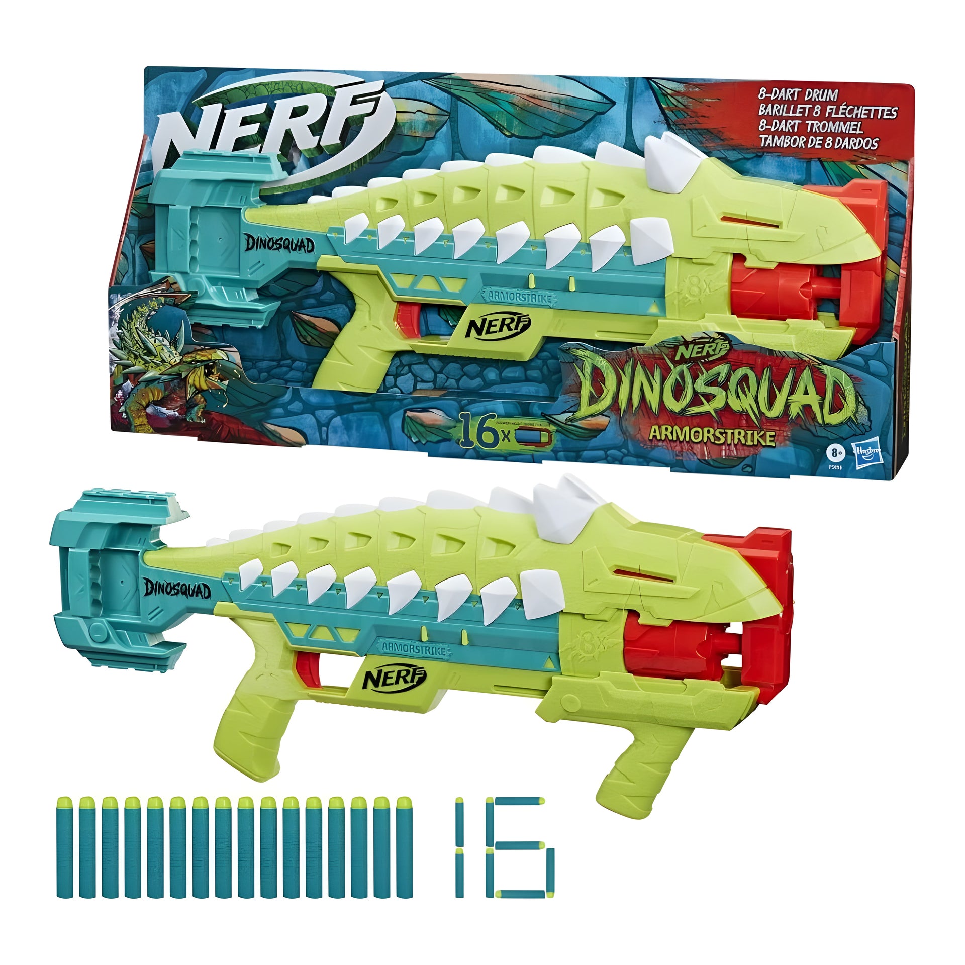 Team up with legendary dinosaurs as a member of the elite DinoSquad! Harness the extraordinary force of the greatest dinosaurs of all and blast into amazing adventures! Charge into action with the Nerf DinoSquad Armorstrike blaster! It features an awesome dinosaur design, capturing the look of an Anklyosaurus dinosaur. Launch 8 darts in a row from the blaster's 8-dart rotating drum to show your targets that you have plenty of dino-power! Pump the drop grip to prime the blaster and take advantage of its below-the-barrel design to steady your aim. The blaster includes 16 Official Nerf Elite foam darts -- 8 darts to load the drum and 8 darts for reloads. And you can keep those 8 backup darts nearby because the blaster has onboard dart storage.