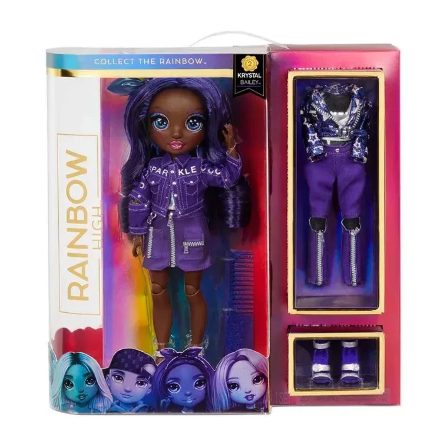 Legend says at the end of the rainbow, there's a pot of gold. But the truth is, it's something even more amazing. Only a chosen few with an eye for bold fashions can follow the rainbow to Rainbow High, the colorful fashion school where everyone learns to flaunt their true colors. Collect the Rainbow of beautiful fashion dolls with Rainbow High. Introducing Krystal Bailey. She is dressed in indigo from head to toe, and she has gorgeous features, long eyelashes and beautiful, brushable hair. She is fully articulated and posable. Her arms and legs bend, so she can strike tons of glamorous poses. Krystal comes with 2 complete outfits to mix and match for bold, showstopping looks. Krystal has a trendy, detailed style that always makes headlines. Dress her in her two tailored jackets, a detailed skirt, jeans, tops and 2 pairs of trendy heels and more. Also includes hair comb, two hangers and a doll stand., PRO TIP: When first unboxing doll, wash her hair thoroughly to remove styling gel and let hair dry completely. Then, her hair is ready to brush.