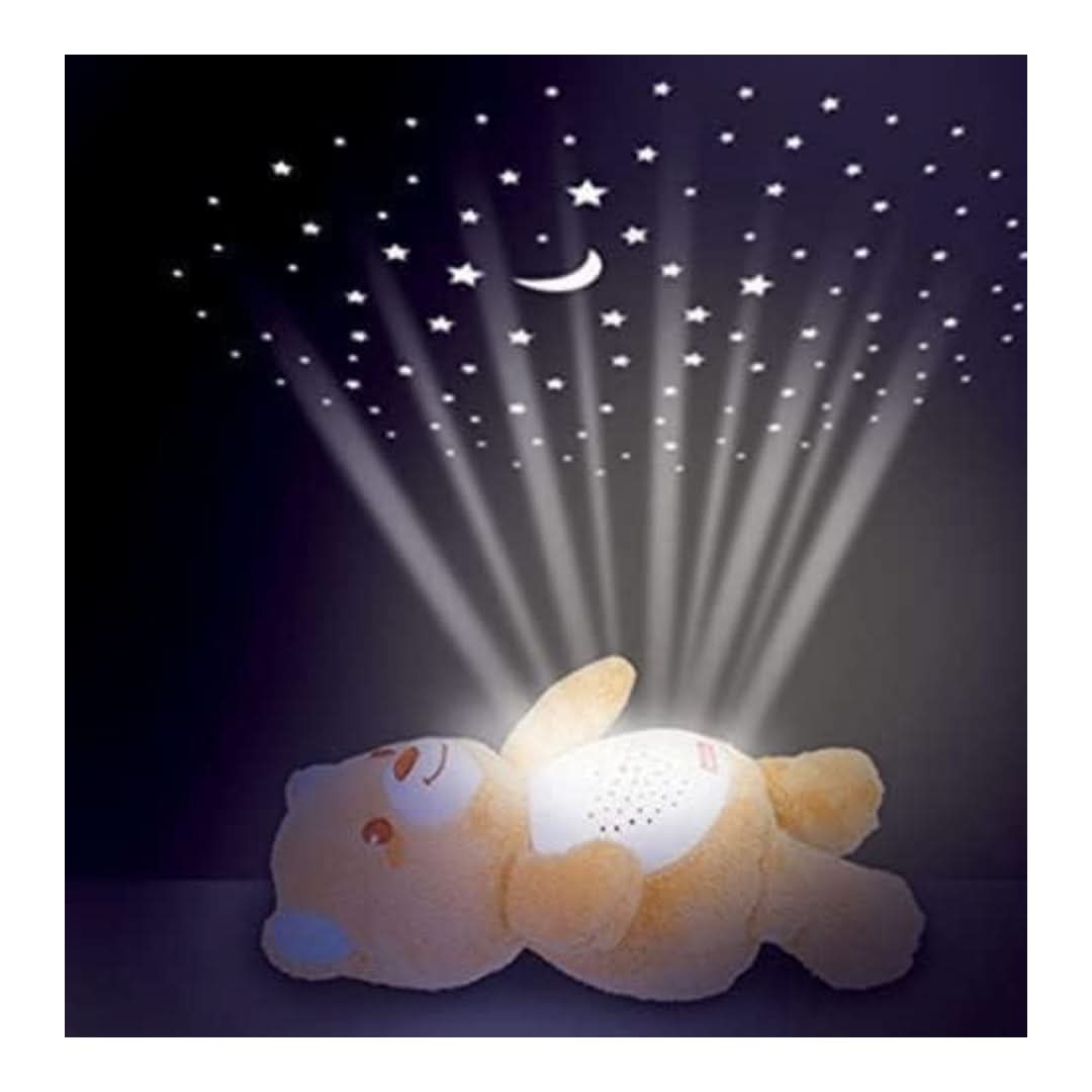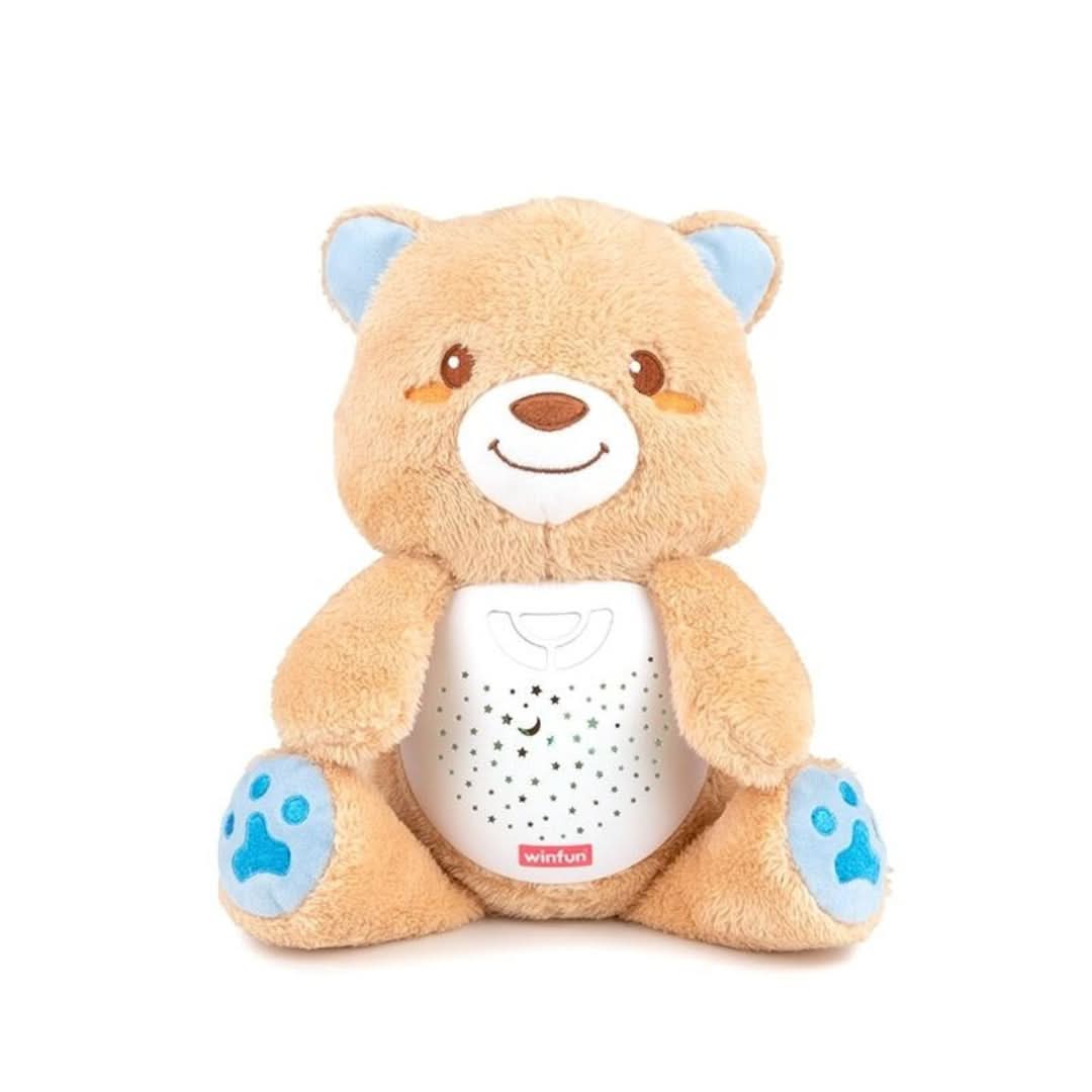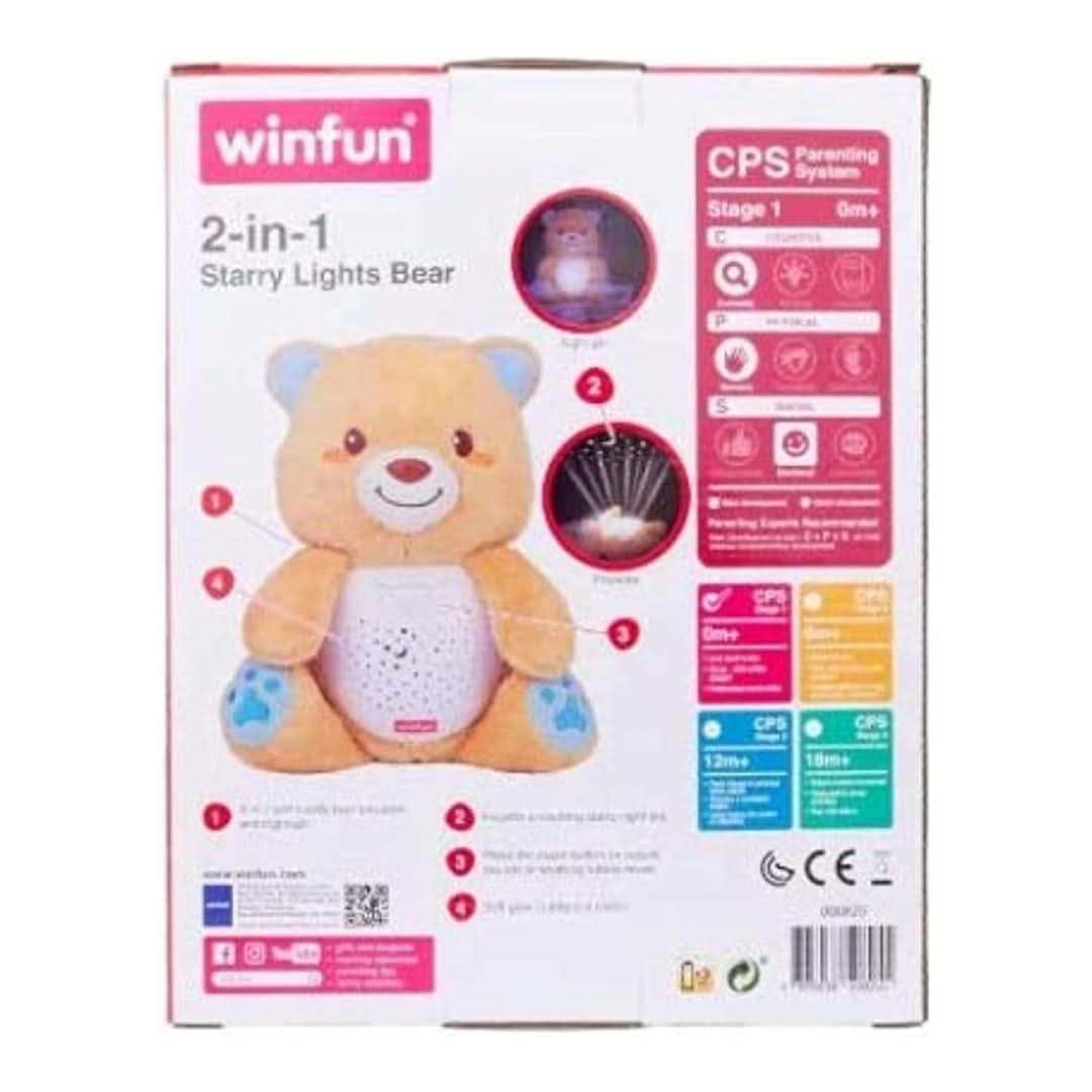 Soothe your little one with the Winfun 2-in-1 Starry Lights Bear Toy 2-in-1 teddy bear duals as a projector and a nightlight Lay the bear on its back to project a starry night sky on the ceiling In nightlight mode, the bear's tummy has a soft glow in different colors Press the music button to hear nature sounds or soothing lullaby music