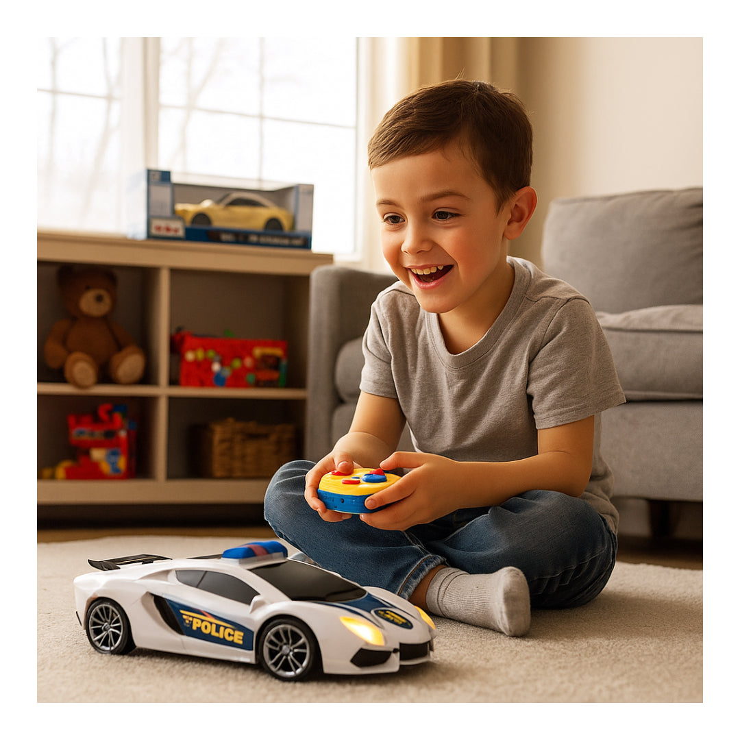 Bring action and excitement to your child’s playtime with the City Police High-Speed RC Car. Designed to resemble a futuristic police supercar, this remote control vehicle combines speed, flashing lights, and cool police graphics to deliver an adrenaline-packed driving experience for kids. Equipped with a rechargeable battery and radio frequency control, this toy is perfect for indoor and outdoor play. Eye-catching police decals and a sleek supercar body Flashing rooftop siren light and realistic detailing Remote Control Operation Easy-to-use controller with forward, backward, left, and right functions Radio frequency (R/C) for smooth and responsive control Rechargeable Battery Pack Comes with a USB rechargeable battery for the car Long-lasting fun with eco-friendly power solution LED Light Effects Headlights and rooftop police lights enhance nighttime play and realism Product Specifications: Dimensions: 33.5 cm (L) × 10 cm (W) × 15 cm (H) Material: High-quality plastic body with rubber tires Age Recommendation: 3+ years Control Type: Radio Frequency Remote Control Battery Type: Car: Rechargeable battery (included) Remote: 2 AA batteries (not included) What's in the Box: 1 × City Police RC Car 1 × Remote Controller 1 × Rechargeable Battery Pack 1 × USB Charging Cable 1 × User Manual (optional) Benefits for Kids: Encourages creative role play (pretend police chase, missions) Develops hand-eye coordination and motor skills Promotes outdoor physical activity and interactive play Ideal For: Birthday or holiday gifts RC car enthusiasts Boys and girls who love action-packed vehicles Indoor and outdoor racing fun.