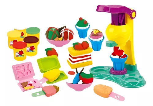 This toy helps in enhancing kid's imagination and creativity It helps in improving hand-eye coordination First, you fill plasticine in the top of ice cream maker, then you press to get your ice cream It includes: ice cream making machine, 5 doughs, molds and other accessories Color: Brown, yellow, red, white and green Recommended age: 3 Years and above