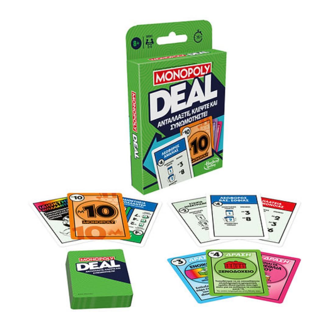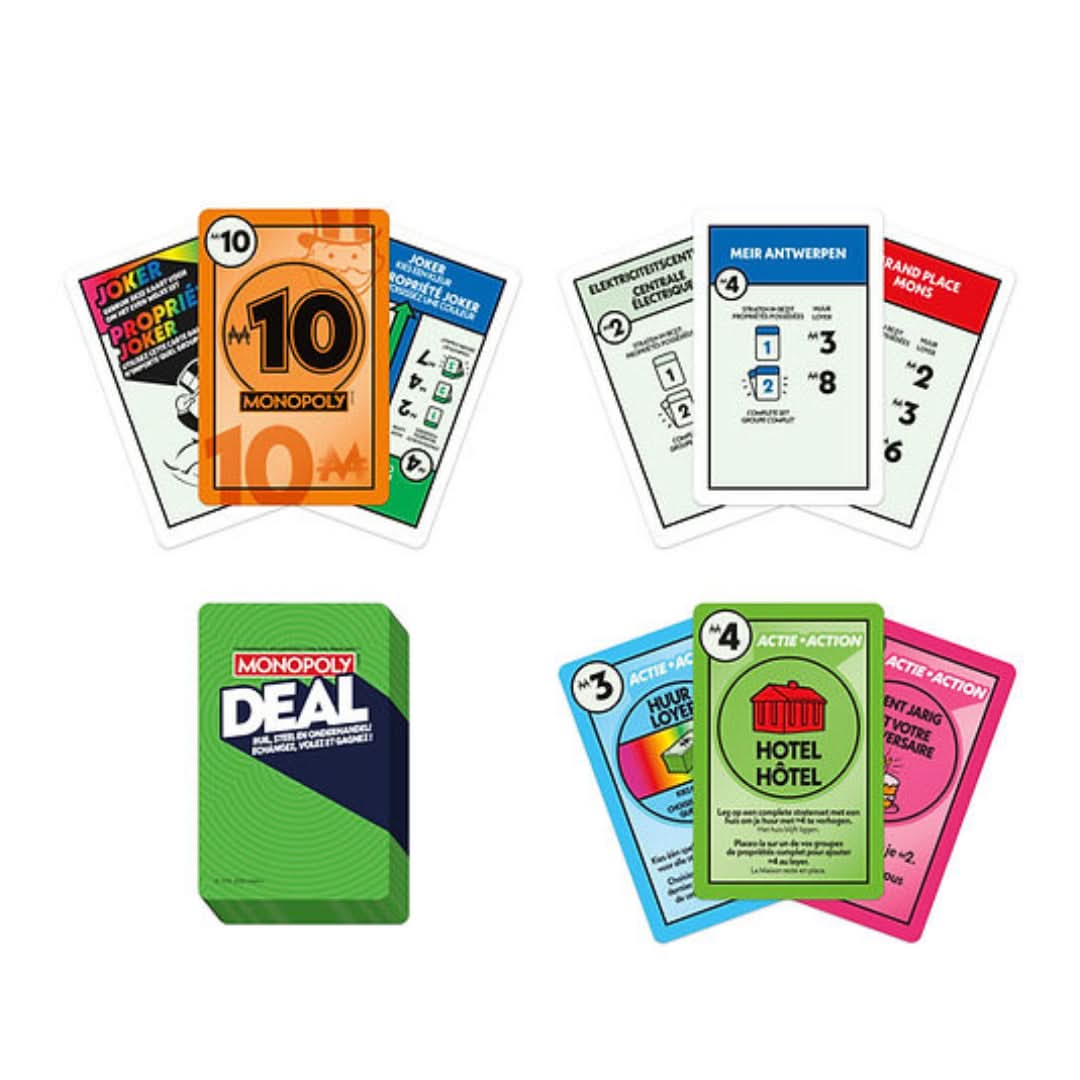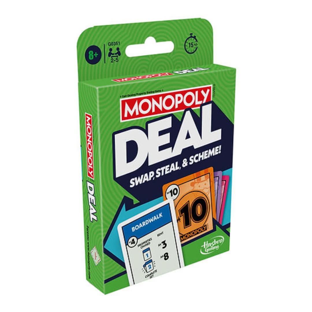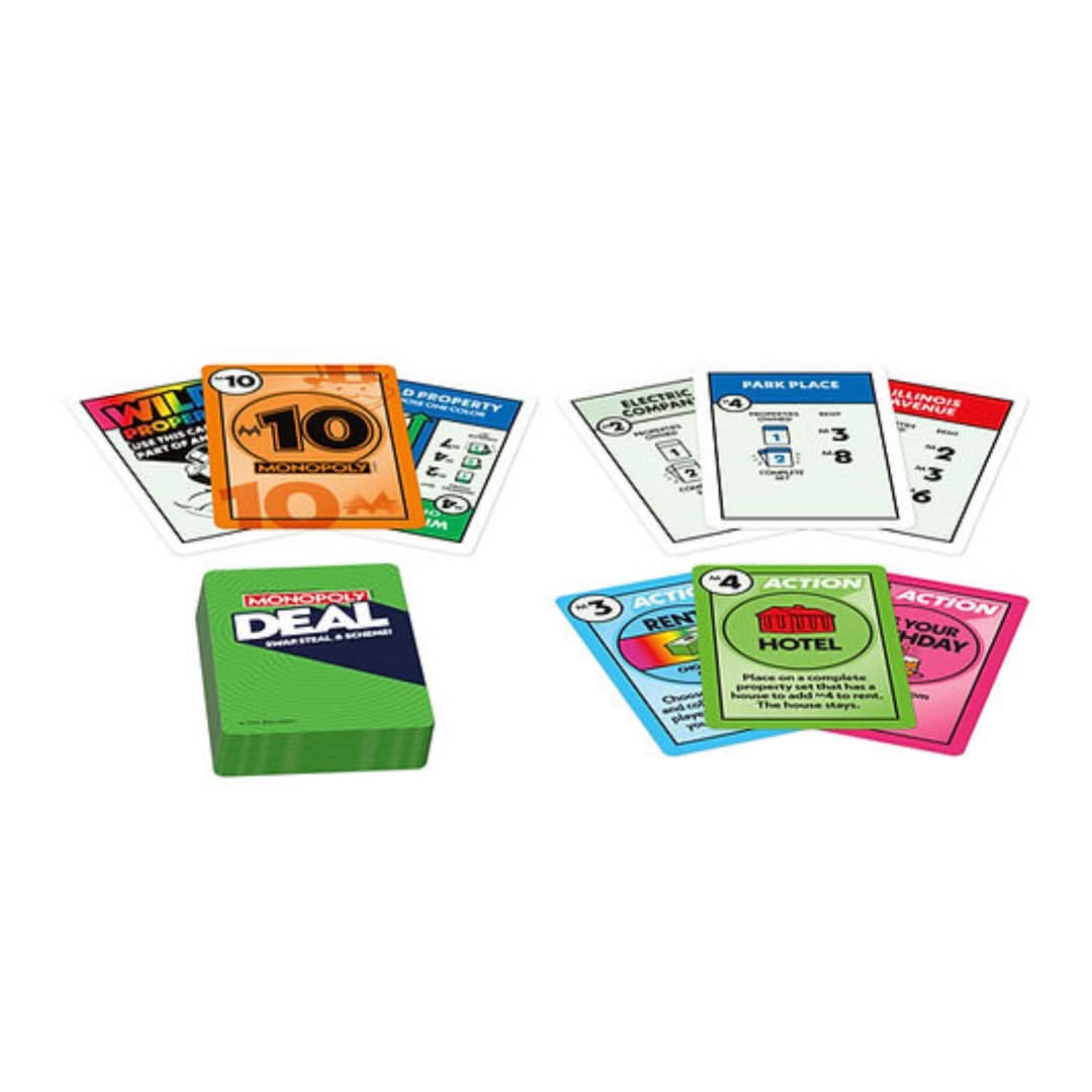 Monopoly Deal is the fast-paced, card-based version of the world-famous Monopoly game. In this refreshed edition, the game has been enhanced with updated features and designs for even more excitement and engagement. Collect properties, charge rent, and make quick deals to bankrupt your opponents and win!