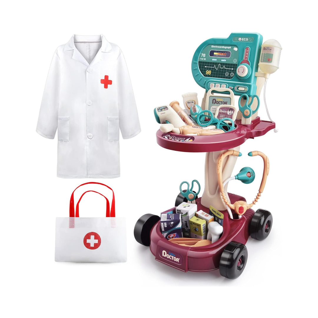 - A complete fun of medical tools: The doctor cart kit comes with doctor role play costume,medical bag,stethoscope,syringe,endoscope,thermometer,eye chart,glasses and more. Press the button of the stethoscope and the light will come on and be accompanied by a sound.