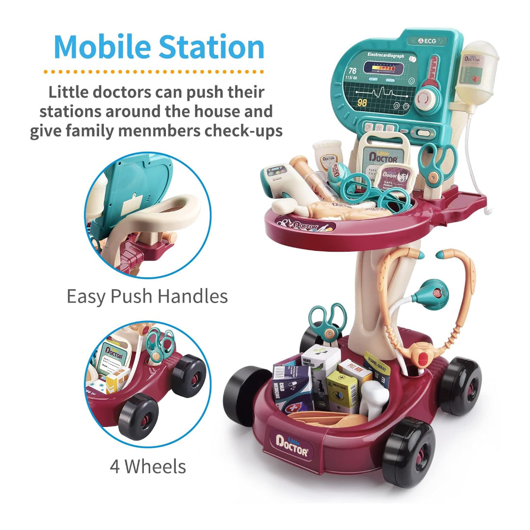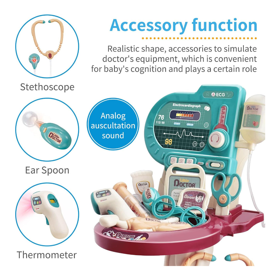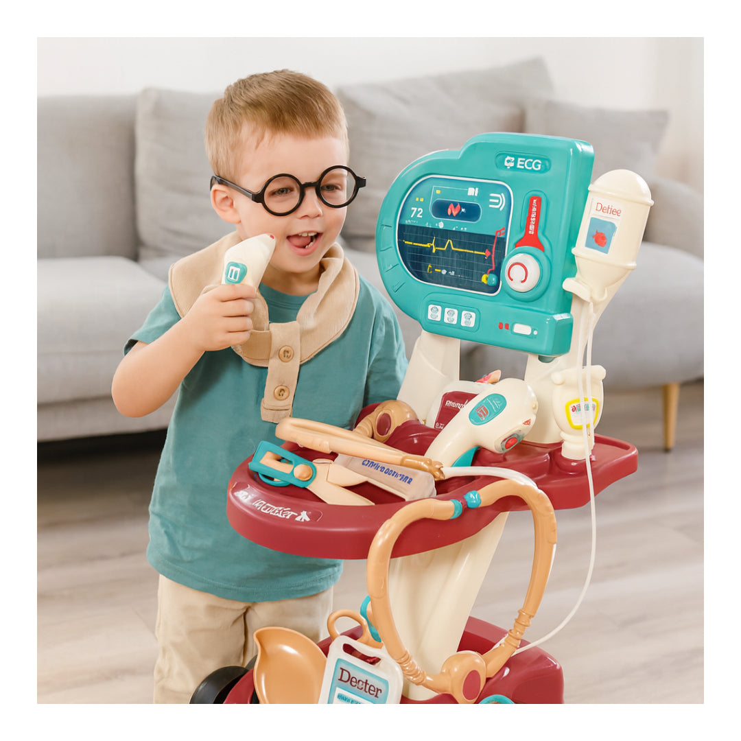 - A complete fun of medical tools: The doctor cart kit comes with a stethoscope, syringe, endoscope, thermometer, eye chart,glasses and more. Press the button of the stethoscope and the light will come on and be accompanied by a sound.
