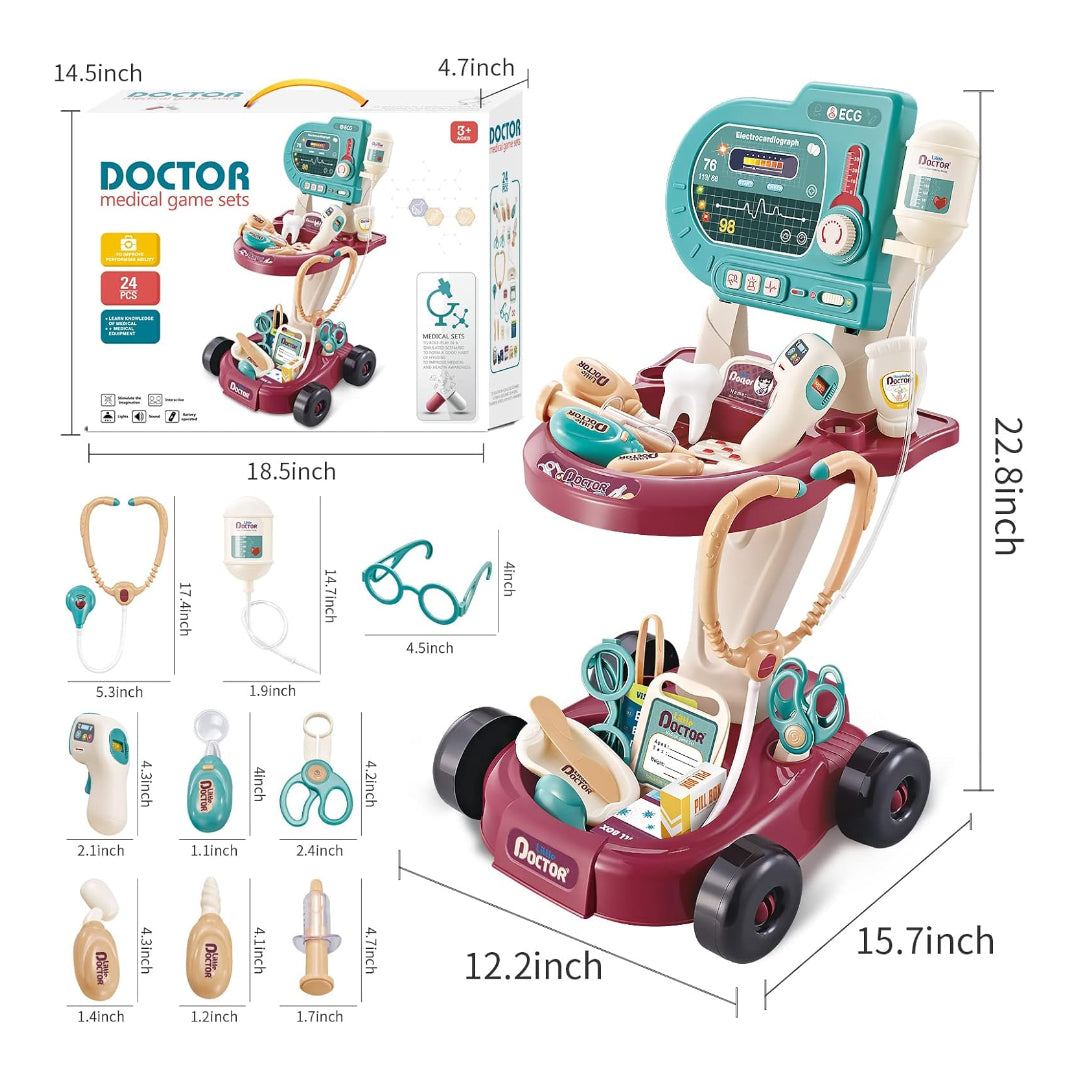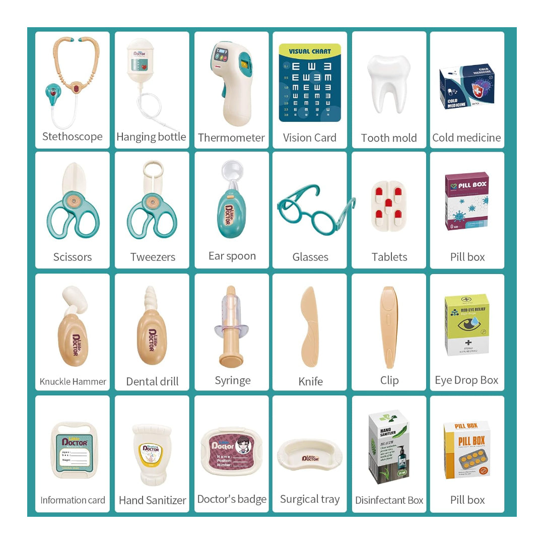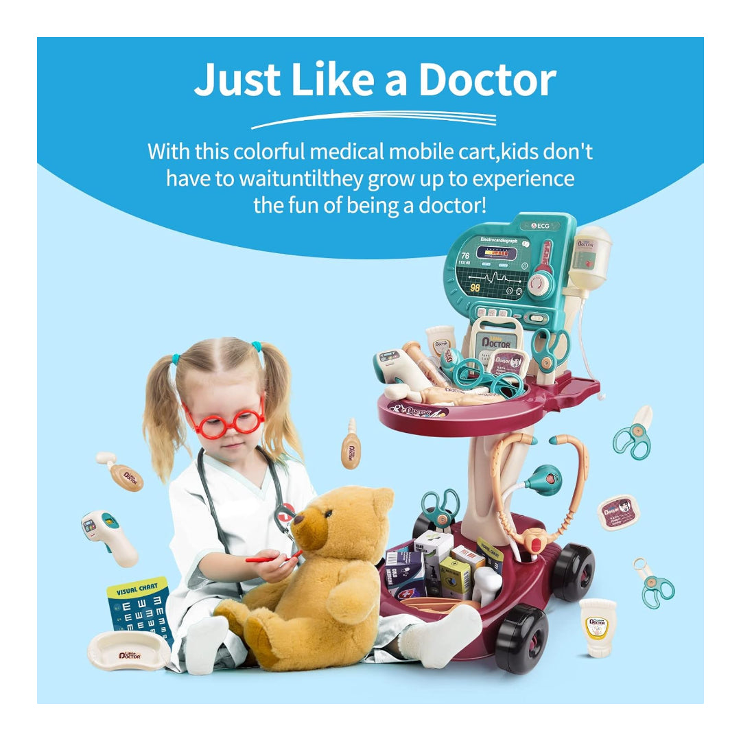 - A complete fun of medical tools: The doctor cart kit comes with a stethoscope, syringe, endoscope, thermometer, eye chart,glasses and more. Press the button of the stethoscope and the light will come on and be accompanied by a sound.