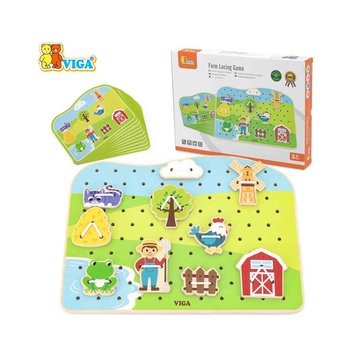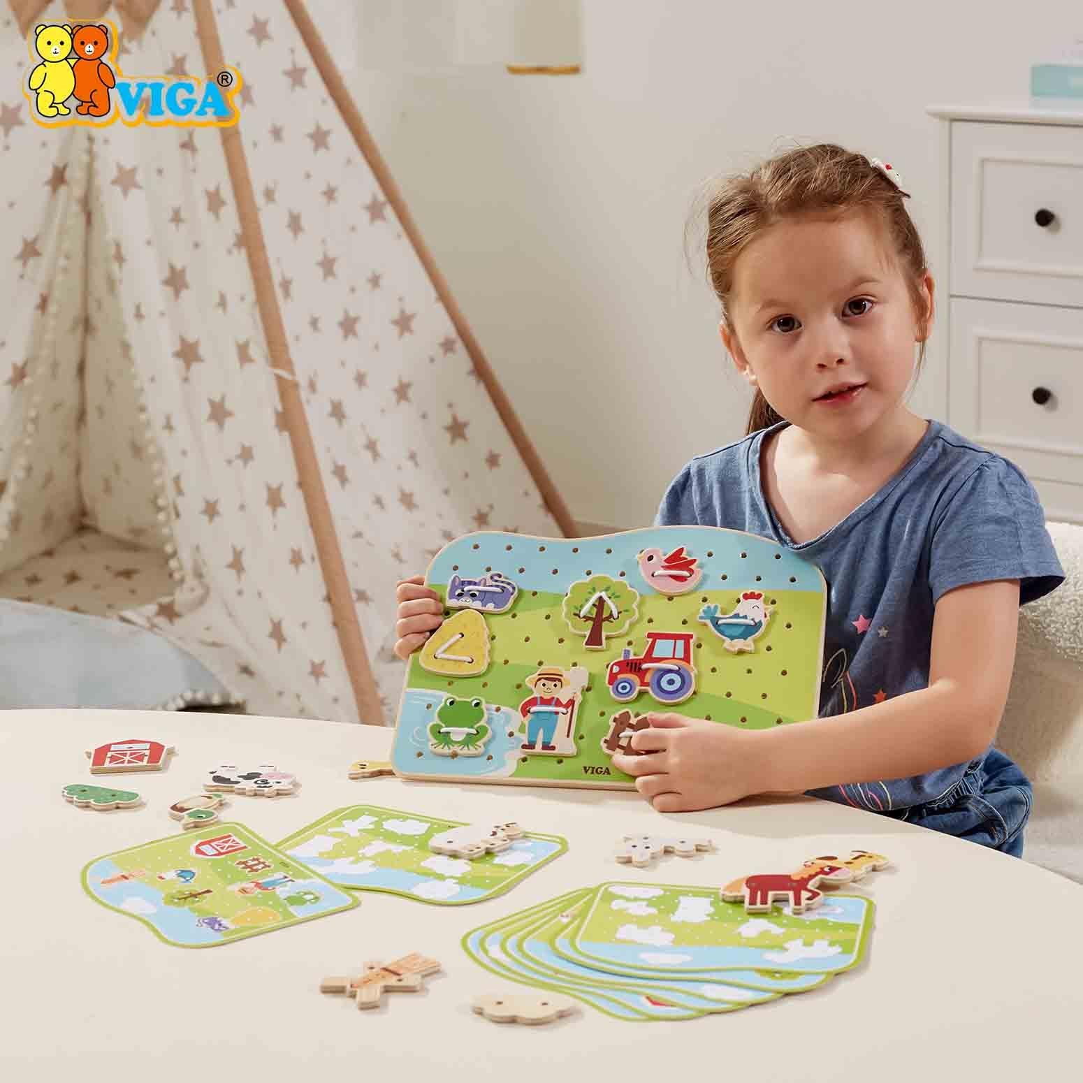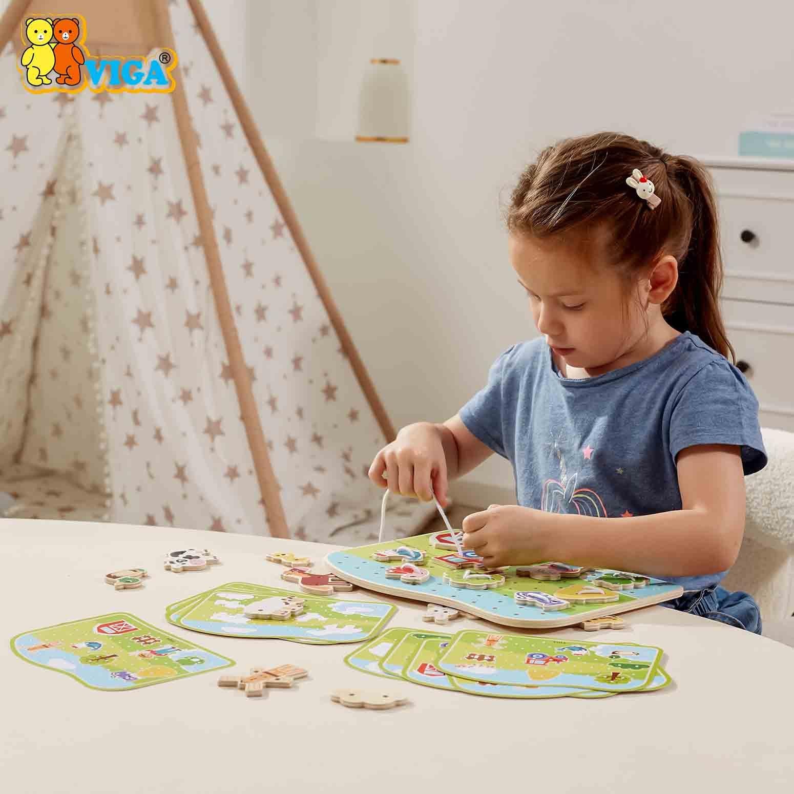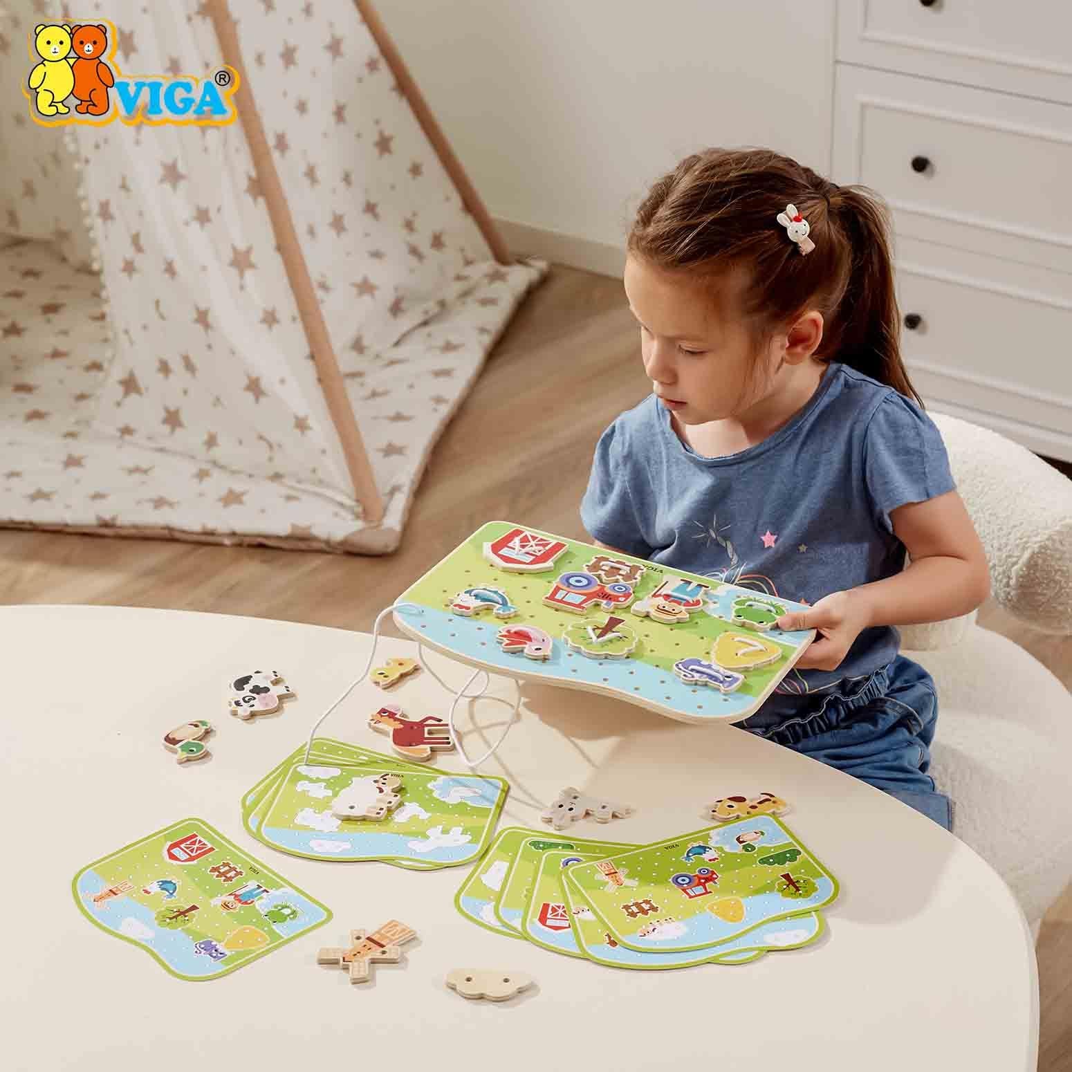 This farm themed threading toy includes a wooden play board, 20 threading tiles, 3 threads and 10 template cards that show different ways to thread the accessories onto the board. *Children can also create limitless scenes through their imagination. *Helps to train fine motor skill, shape recognition ability, spatial orientation and hand-eye coordination.