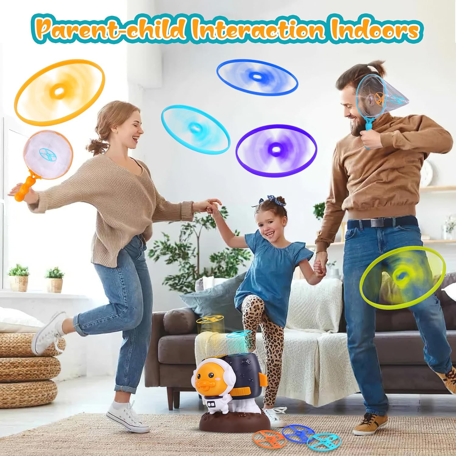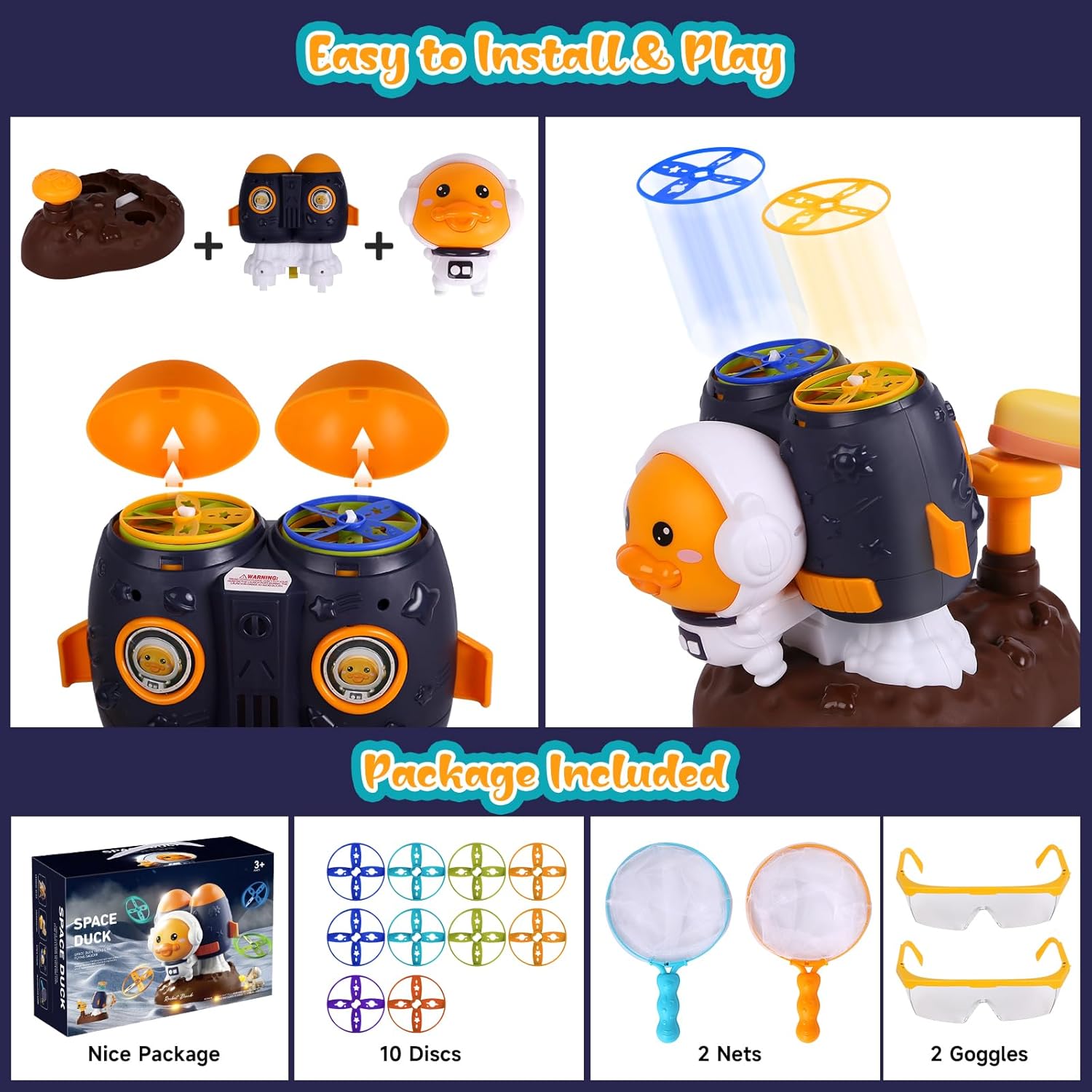 Unique Rocket with cartoon duck design can fully arouse children's interest. - This Toddler Outdoor Toys will launch discs into the sky when kids step on the switch. - Package includes 10 colorful frisbees and two capture nets to create a exciting game between single and multiple players. - Chase and Catch as many frisbees as possible. - Suitable for 2+ year old kids.
