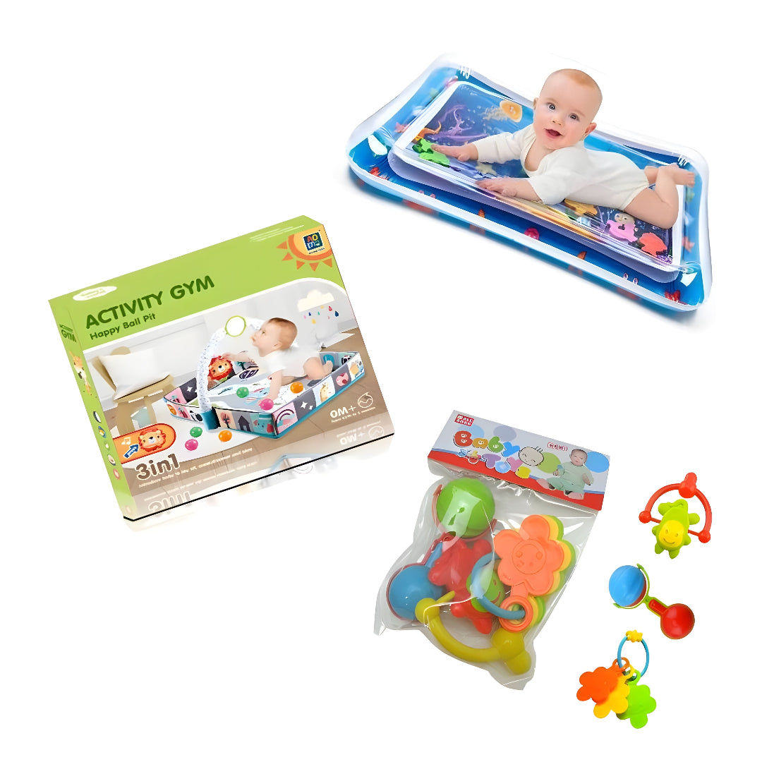Includes: 3 Items – Rattle Toy Set, Water Mat, Activity Gym A perfect bundle to nurture curiosity, support early milestones, and make playtime magical.