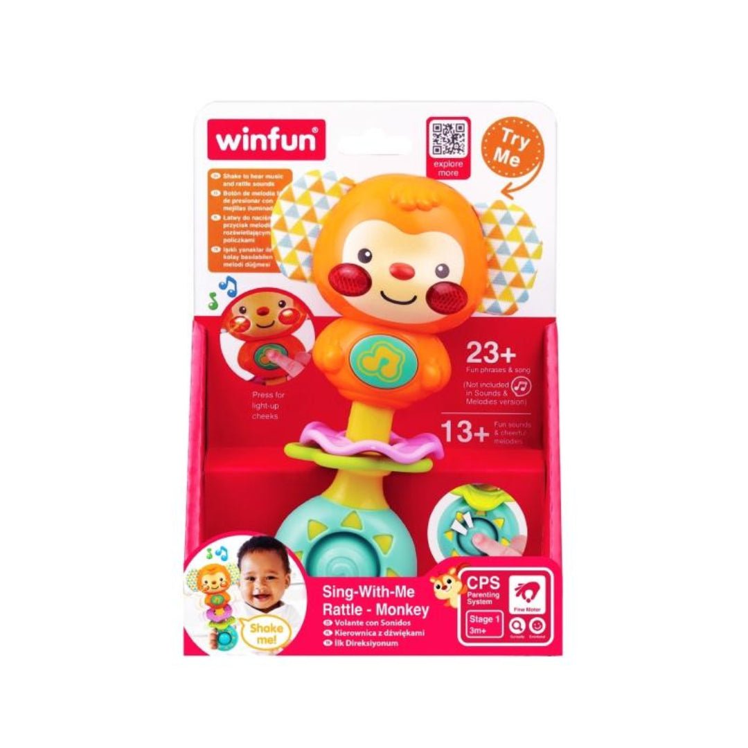 Monkey Rattle Sensory Fun for Babies from 0 Months + The monkey rattle is the perfect toy for babies from 0 months old, designed to stimulate sensory development and fine motor skills. Easy to grip, with an ergonomic design, this toy has crinkled ears that offer an interesting texture for tactile exploration. By pressing the melody button, the monkey's cheeks light up in a fascinating combination of colors, capturing baby's attention and stimulating their visual senses. In addition to the lights, the toy emits fun sounds and phrases, as well as songs and melodies that will amuse and delight your little one. These sounds are perfect for developing auditory perception and introducing baby to the world of music and sounds. The rattle is equipped with rings that, when shaken, produce sounds that encourage active interaction, helping to develop hand-eye coordination and understanding of cause-and-effect relationships. Compact and easy to carry, the monkey rattle is ideal for taking anywhere, ensuring that your baby will always have a playmate at hand.