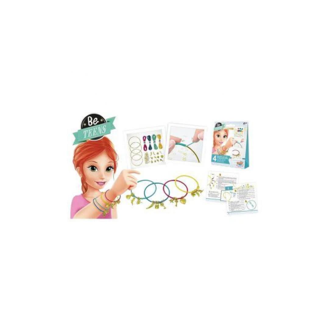 This box contains: 4 metal bracelets; 4 colors of cotton thread; 60 rings; 12 charms