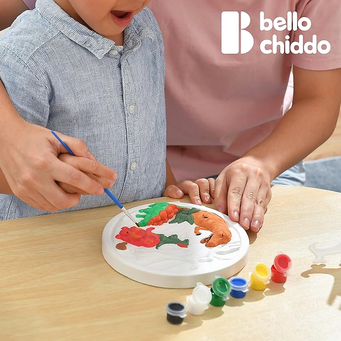 Each set comes with 2 paintbrushes and 1 set of paints. These paints are safe for kids and come in 6 mixable colors so they can learn to mix and create new shades. The paints are also washable, so you don't have to worry about them getting your hands or table dirty; they can be easily washed off with water. Our dinosaur painting toy sets for girls and boys are the perfect gift. Parents can use their imaginations with their children, perfect for family communication and play. The paints take only a few minutes to dry after being applied to the gessoed drawing board. Place the finished painting on an easel and display it on a table or in a closet in your room to preserve those memories. This activity is a great way to develop imagination, focus, and attention. Exercise children's focus by designing this dinosaur painting toy to keep them engaged while they play. Create a unique work of art. Easy to wash: Since children will have paint on their hands or face, the paint can be washed off very quickly by simply rinsing with soap or water. Parents don't have to worry about the paint being difficult to clean, so children can enjoy their painting talent without any further worries. Fun Painting Toy: This toy is suitable for girls and boys over 3 years old, and children can start painting at any time. This painting toy includes a dinosaur painting mold, a display stand, 2 paint brushes, and a paintbrush with 6 colors. Allows children to use their imagination to complete their own painting.
