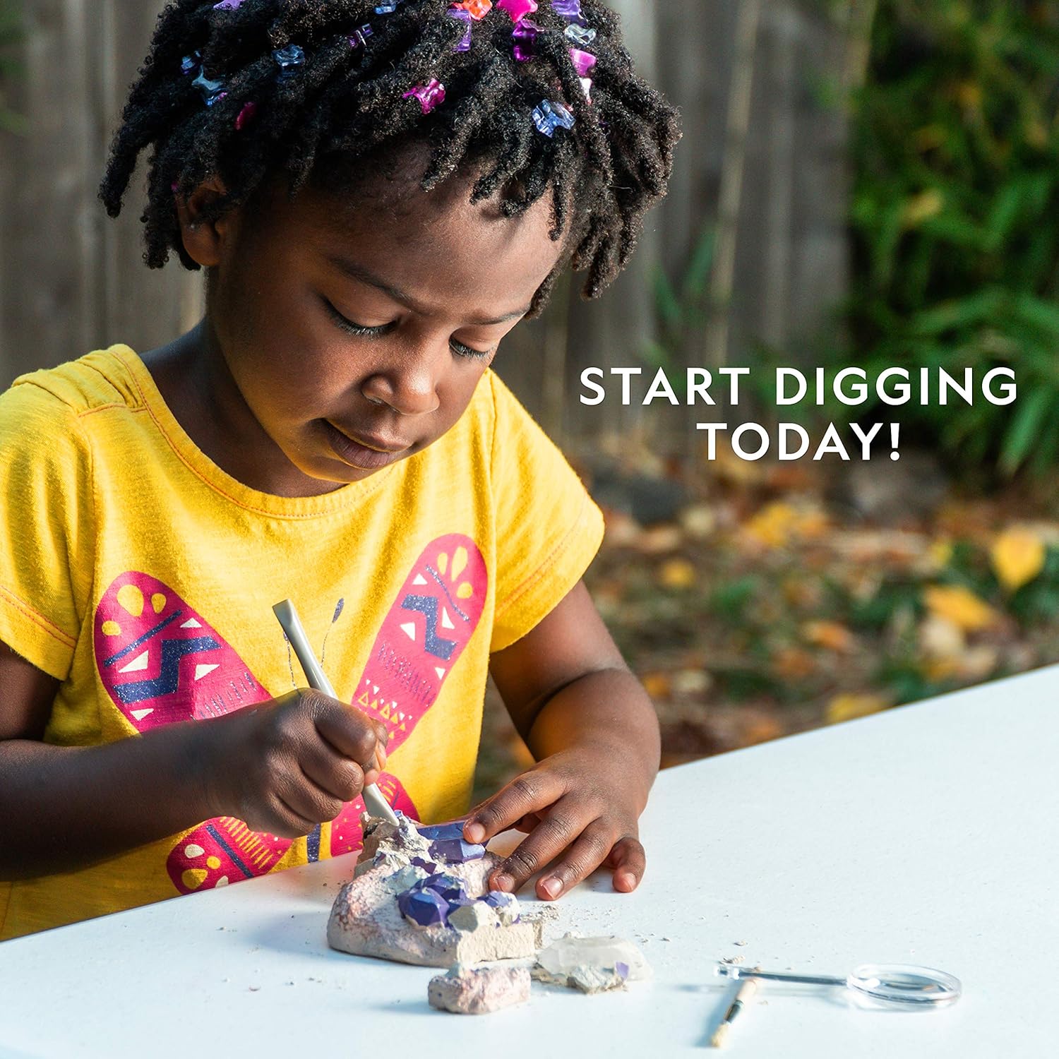 Experience the thrill of discovery with the National Geographic Gemstone Dig Kit! You’ll excavate tiger’s eye, amethyst, and quartz from the dig brick with the included dig tools, just like a real geologist. A full-color learning guide provides fascinating insight into your new specimens, and a magnifying glass allows you to get a closer look at each. This hands-on science kit is an exciting way to explore the awesome world of geology right at home!