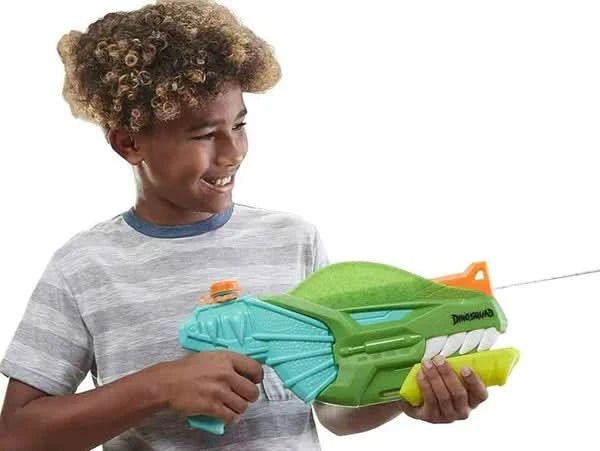 Nerf Dino squad Dino-Soak Water Blaster: Unleash a stream of water from the dinosaur's mouth! Head outside and take aim at your targets to pour on water-blasting dinosaur action Awesome Dinosaur Design: This Nerf Super Soaker Dino Squad water blaster captures the look of a Dilophosaurus dinosaur for wild outdoor games and summer soakage fun. Easy To Fill, Easy To Fire: Open the cap and fill the tank with water, close the cap, and keep pumping the handle backward and forward to spray a dinotastic deluge of water. Recommended Age: Suitable for 6 years & above