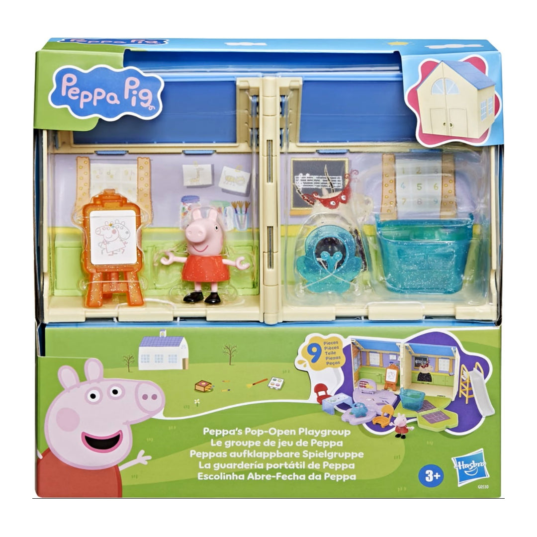 The Peppa Pig foldable playgroup playset invites children to invent imaginative preschool stories! Kids can open and unfold the schoolhouse to reveal a classroom and playground, and then arrange the accessories as they wish. Is art on the agenda? Here, the Peppa Pig figure can be shown using the easel or sitting on a chair at the art table. What has Peppa crafted? It's a sparkling butterfly mask! The Peppa figure can wear the mask accessory while playing, encouraging children to reenact their favorite moments from the series. Time for a break! Play hopscotch or slide down the slide? (Both!) This Peppa Pig toy set will delight all Peppa fans who love Peppa Pig figures and playsets with its many play possibilities. A great gift for children aged 3 and up.