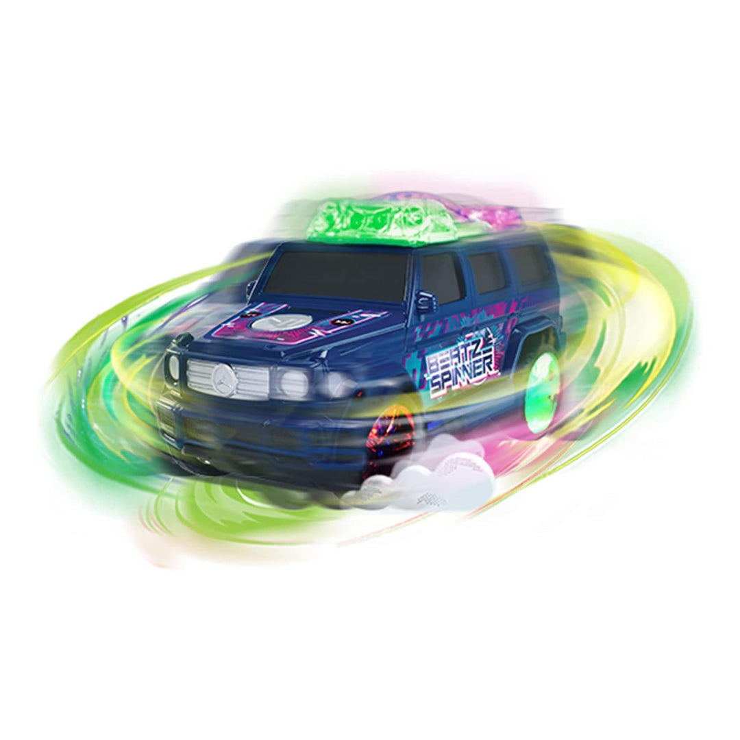 Self-driving toy vehicle with fun songs and more: Mercedes-Benz G-Class "Beat Spinner". The Beat Spinner is available in three variants: A-Class (hip-hop), E-Class (pop) and G-Class (EDM). To create a unique audio experience, Dickie Toys collaborated with a German music producer, who composed special music and sound effects (SFX) for each model. Features: • Cool EDM beats • Officially licensed by Mercedes-Benz • Compact size: 23x10.5x12.5 cm • Color LEDs on the roof and in the wheels • 2 modes: 15 seconds (try me) and 60 seconds (on ) • For children aged 3 years and older Amazing turning and dancing maneuvers When you press the button, the car spins around its own axis ("Spin" function), then moves forward and changes direction when it hits an obstacle (" Bump & Go" function). These two automatic dance maneuvers are accompanied by funky electronic dance music and flashing colored lights. Cool special effects - the ultimate gift for children aged 3 and up. Designed for children aged 3 and up, this feature-packed car has everything you could wish for: a self-driving engine, an on-board music system and colorful flashing lights!