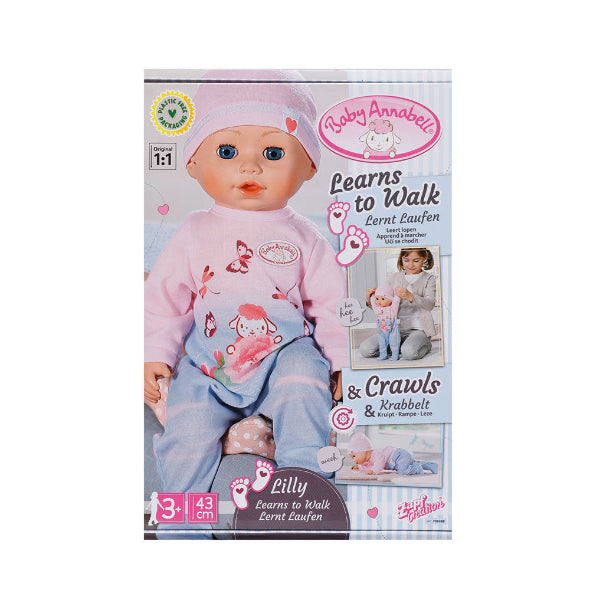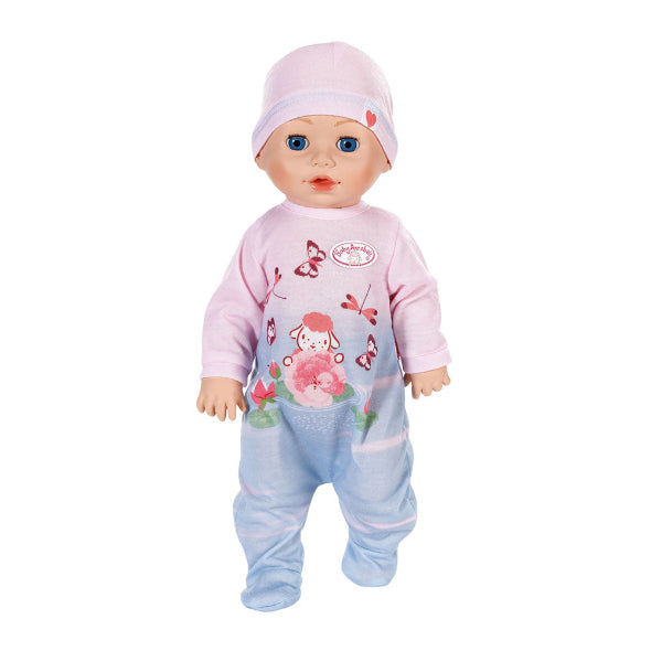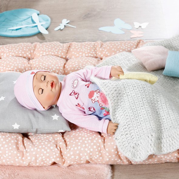 The doll is 43 cm tall and, when you hold her hands, practices walking by taking small steps. When no hand is available or if she’s in a hurry, she crawls through the children’s bedroom on her knees. The pond in the park is her favourite place. There, she always watches the dragonflies flying from one water lily to the next. This scene is also printed on her comfy romper. The colours fade from sea blue to candyfloss pink and the romper features cute ruffles at the top of the arms. The little walker complements the outfit with a pink hat