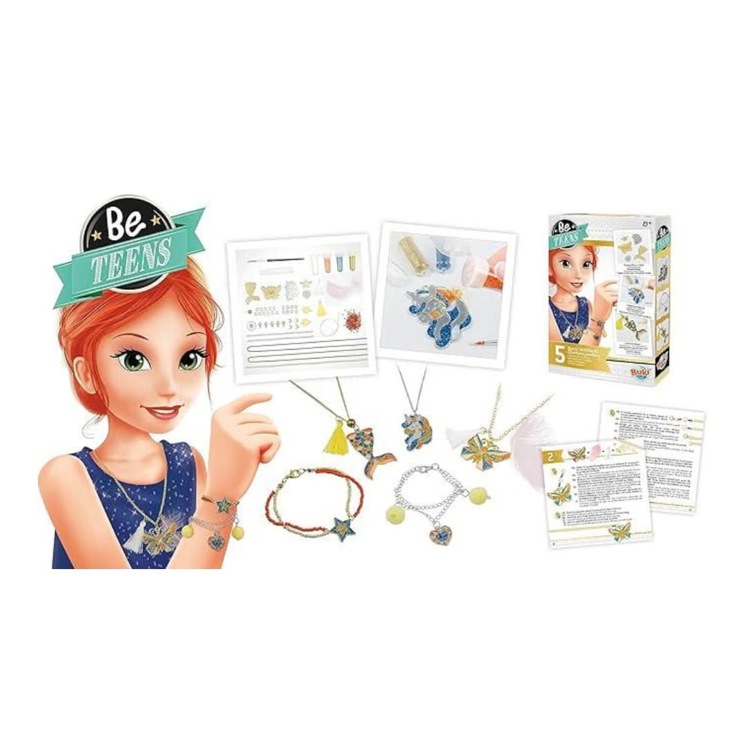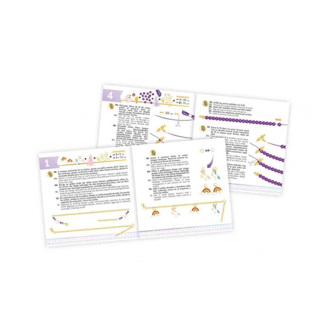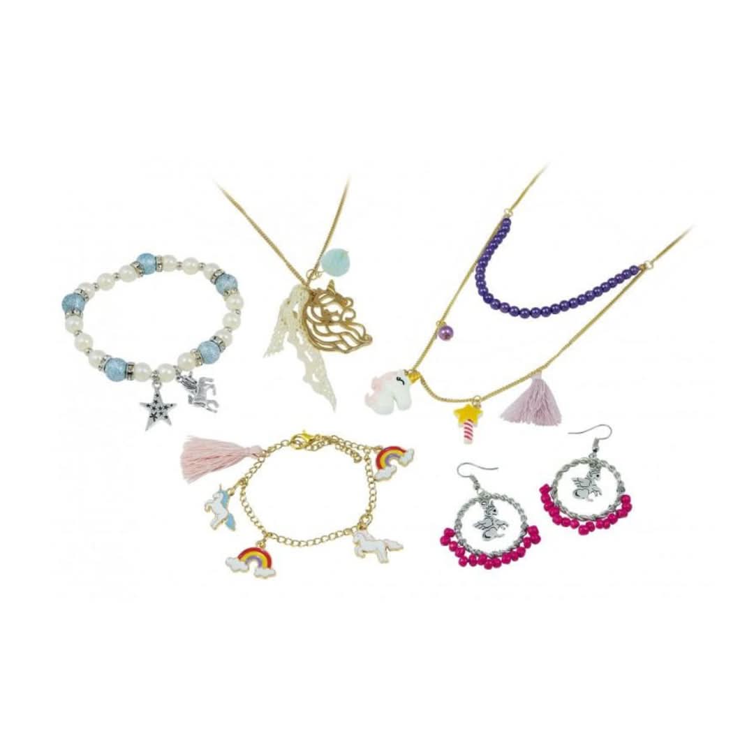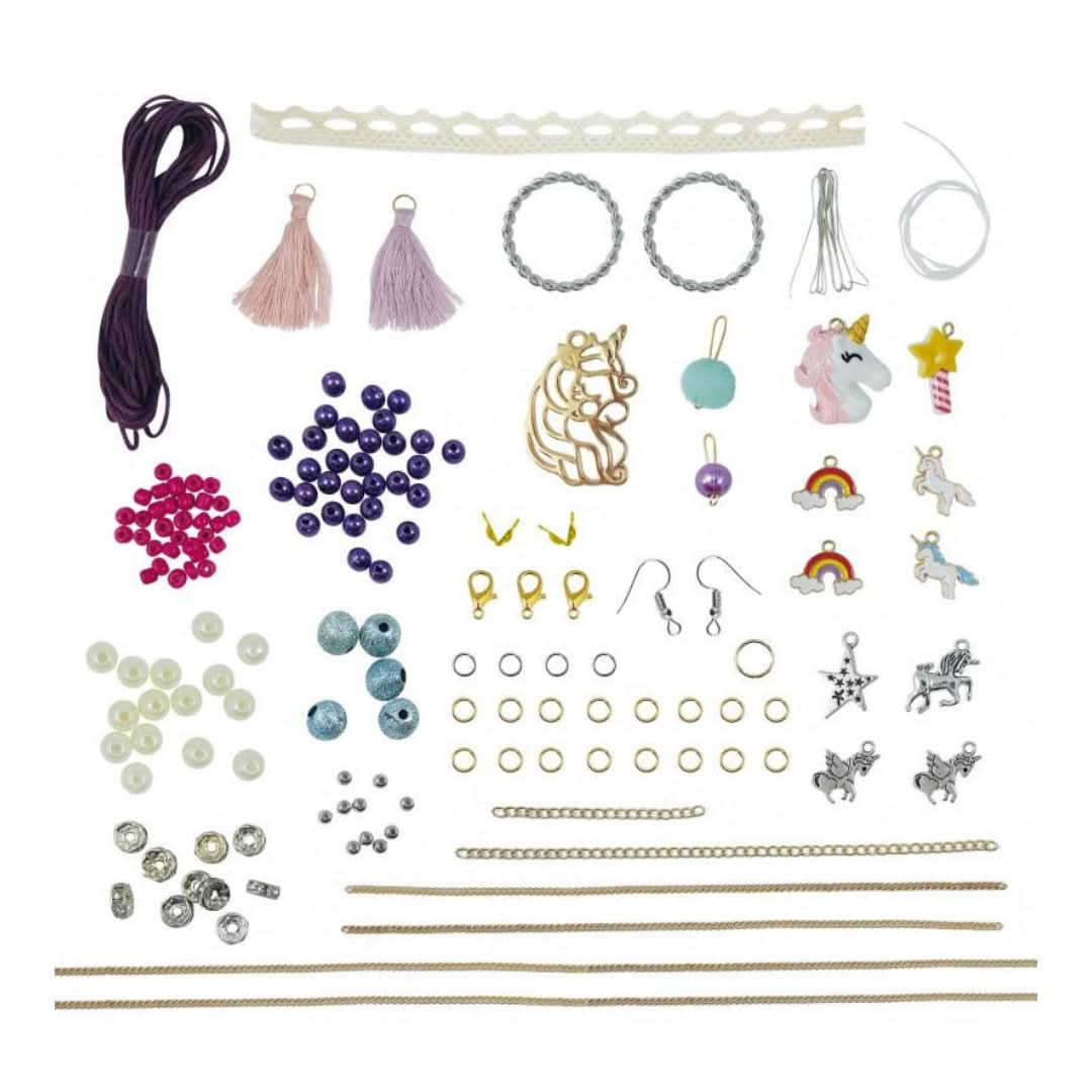 Create 5 trendy pieces of unicorn jewellery. Thread, prepare and assemble the beads and charms. Make 2 necklaces, 1 pair of earrings, and 2 bracelets. , , Contains: coloured charms, gold charms, pompoms, chains, clasps, and more. Instruction sheet with colour illustrations.