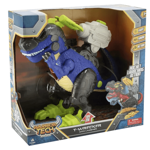 T-Wrecker action dinosaur figures in two colors: blue and red. Designed with a rugged, robotic appearance, these dinosaurs combine classic prehistoric fun with a high-tech twist. The T-Wrecker figures appear to have mechanical parts, with weapons mounted on their backs for an action-packed play experience. Suitable for kids who enjoy imaginative dinosaur battles and robot-themed toys, this set encourages creative role-playing with mechanical designs. Back-mounted weapons add an element of excitement to the play. Ideal for children who enjoy dinosaur or robot-themed toys. Likely suited for ages 3 and up. This set would appeal to children looking for thrilling dino-mech adventures, combining the fierce appeal of dinosaurs with the intrigue of robots.