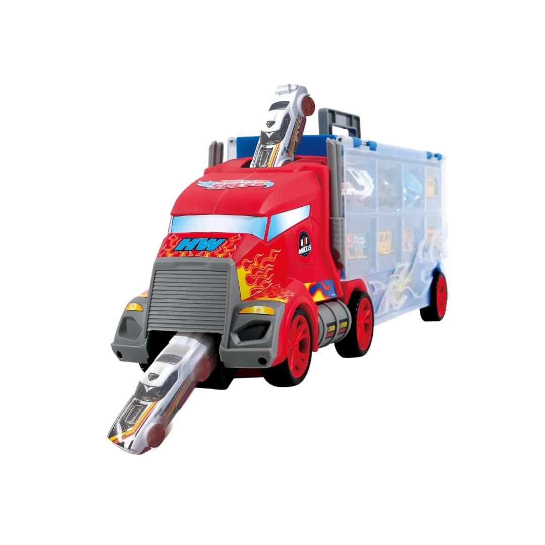 Bisarque truck with 2-sided opening vehicles with practical handle and slide for cars. 3 original Hot Wheels vehicle included and high beam, free-wheeling operation.