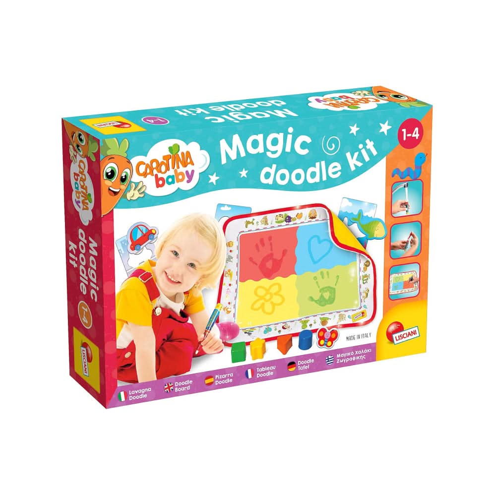 Blackboard mat with water marker is accompanied by a rich hardcover educational kit, with 4 geometric shapes in plastic and a very nice clip booklet with the "Story of a water droplet". The child will have fun leaving his footprints even with wet hands!