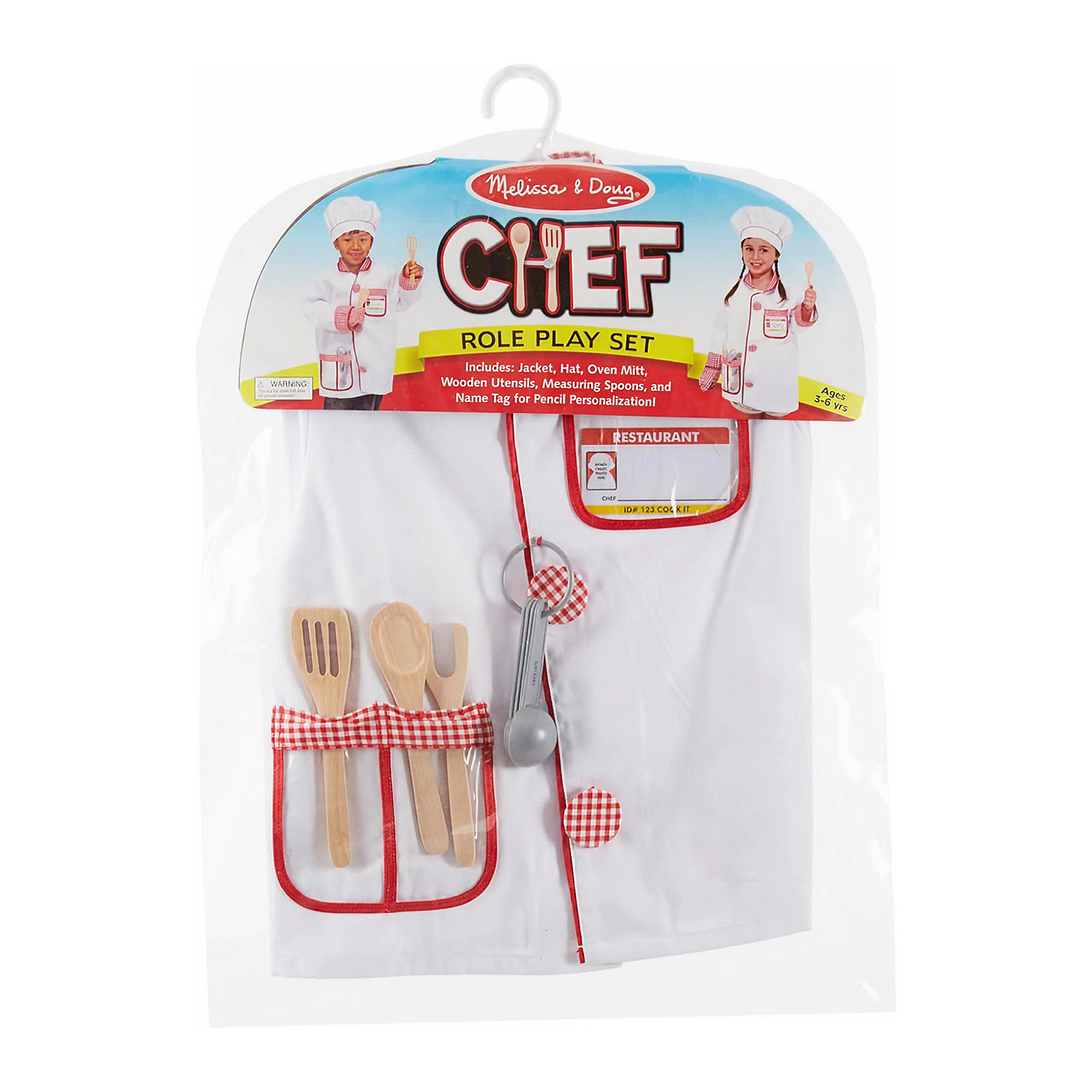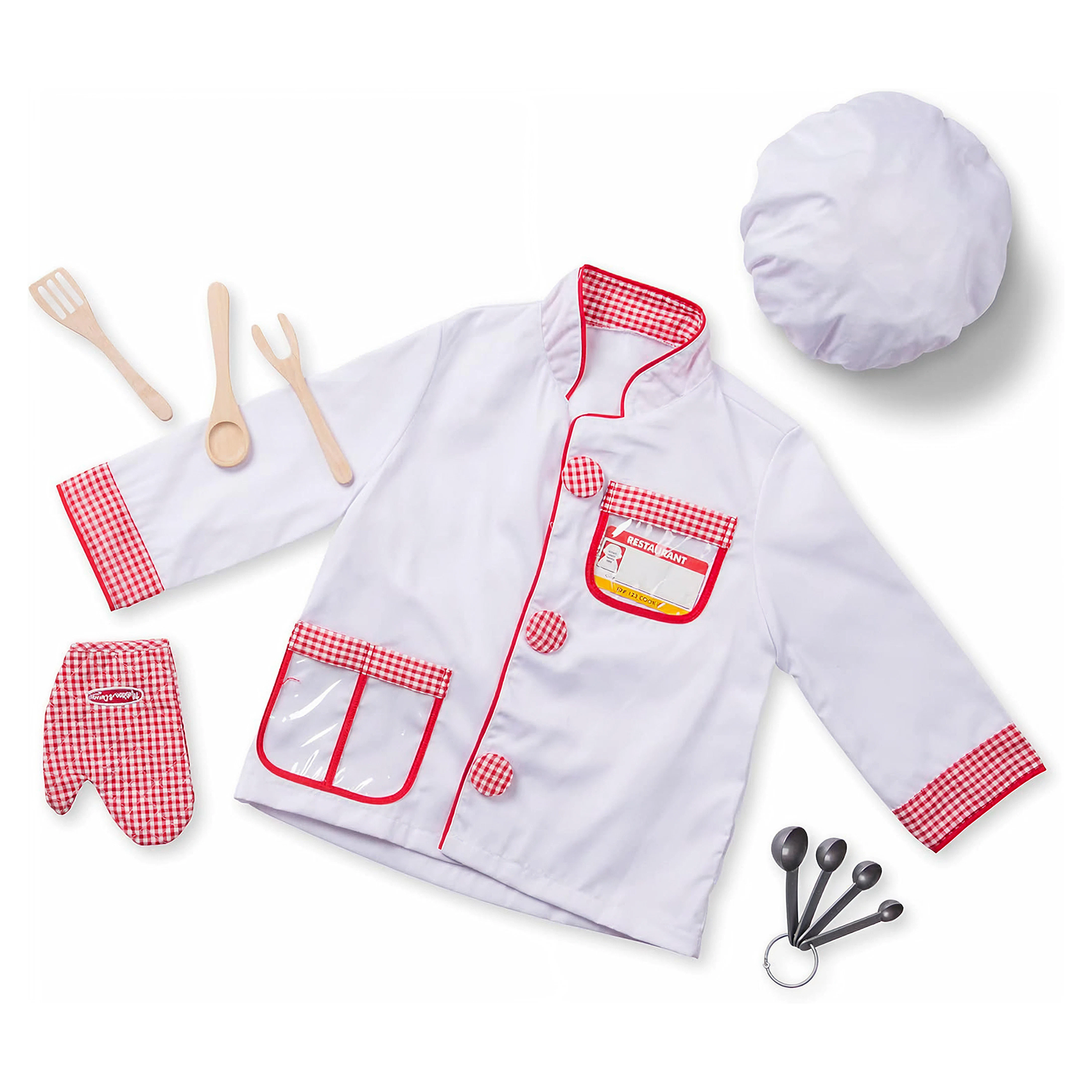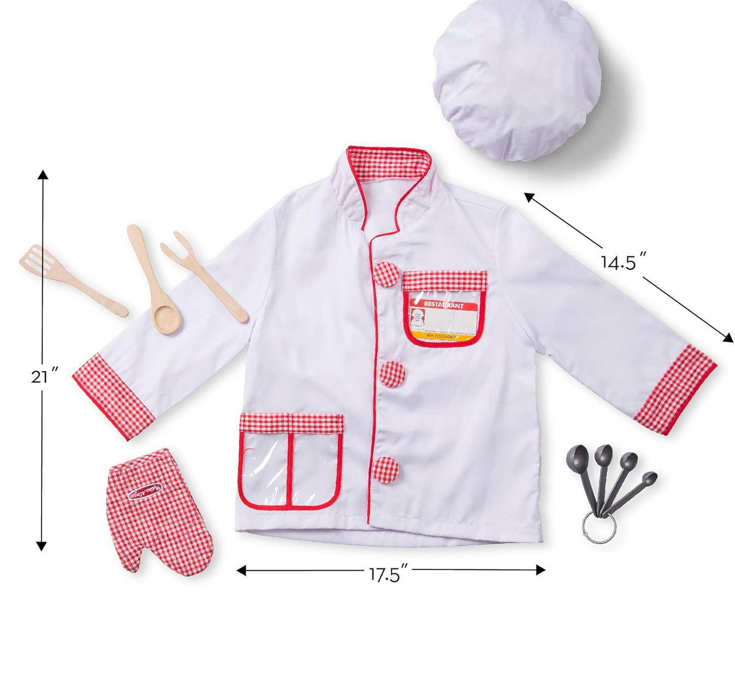 Includes a realistic chef’s jacket and hat, oven mitt, wooden utensils, measuring spoons, and a name tag for immersive pretend cooking play.