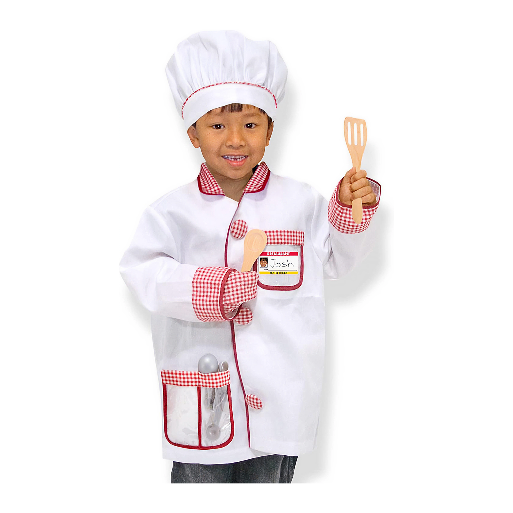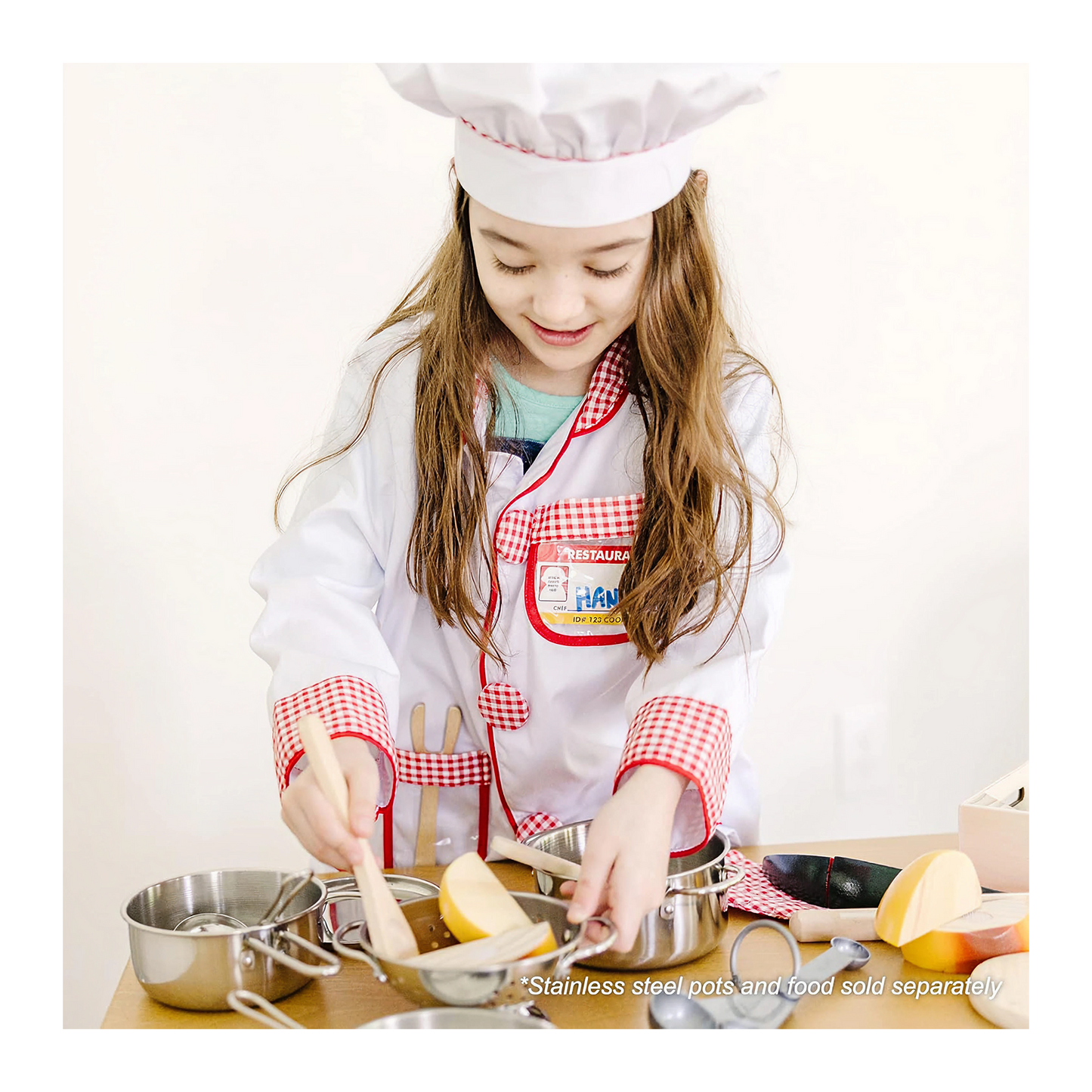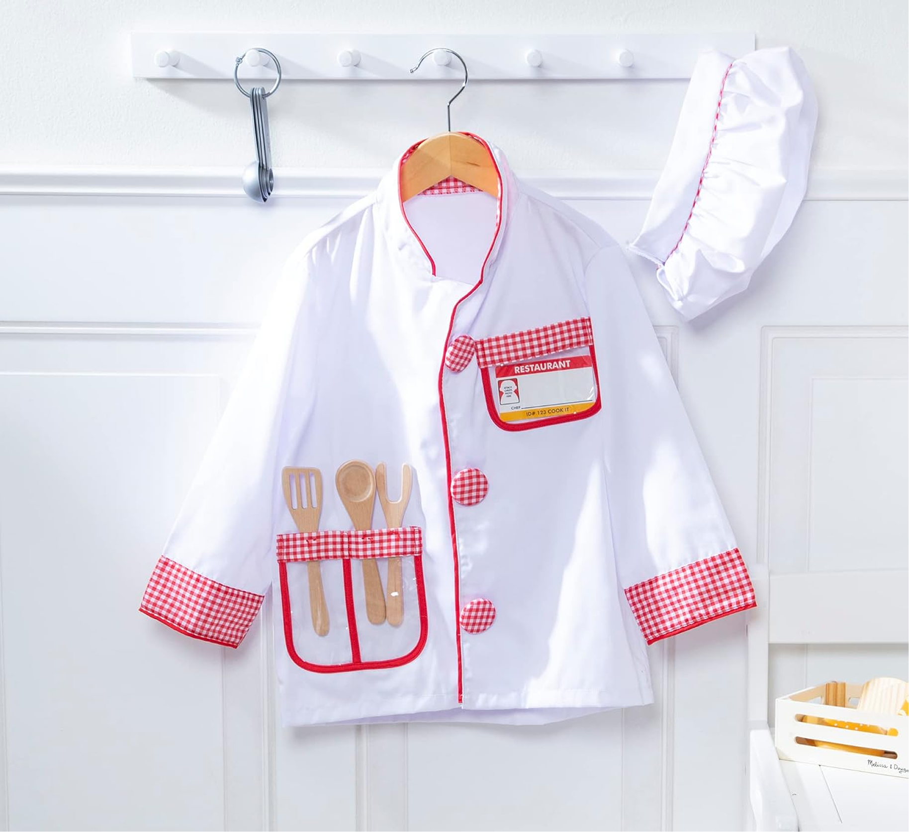 Includes a realistic chef’s jacket and hat, oven mitt, wooden utensils, measuring spoons, and a name tag for immersive pretend cooking play.