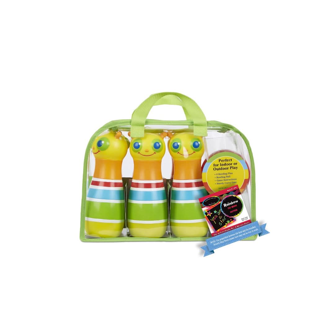 The always-happy Giddy Buggy caterpillar will bowl you over with his smiling face and this exciting toy-sized bowling set! The set includes six bowling pins, an easy grip bowling ball, game instructions, and a sturdy carrying case with handles. Little ones can have loads of fun as they set up the eight-inch bowling pins, roll the toy-sized ball, and knock 'em down! It is part of the Sunny Patch line of products, so it's made to be used both inside and outside. Kids can take it along on play dates, bring it to the beach or the park, or play with it indoors -- it makes a great rainy day activity! Durable construction means that the pins will stand up to many tumbles. It's a great way to spend time with friends and family, or enjoy independent play. The game encourages hand-eye coordination and dexterity, and early counting skills.