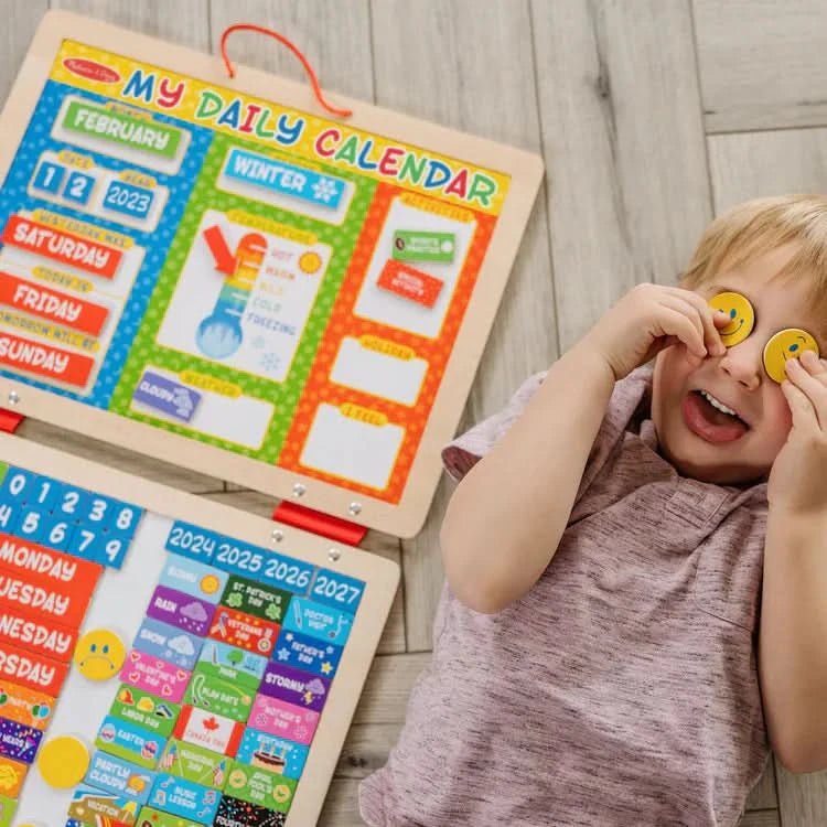 What is today? For a child, that simple question can have so many answers--and this daily calendar helps satisfy them all! Kids will feel a greater sense of control and responsibility when they help post the day of the week, date, weather, and special events on the large magnetic board for all to see. There's even a space to post their mood--an excellent way to open communication and encourage children to gauge their own emotions. Updating the information is simple: Simply take a preprinted magnet from the lower magnetic board (which hangs below the calendar to keep magnets within easy reach). Then place it on the calendar to fill in the information . . . or make a custom magnet by writing on one of two dry-erase magnet tiles! There are fields for day, date, season, weather, temperature, activities, holiday, and mood.
