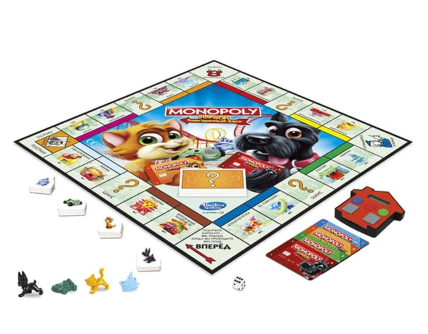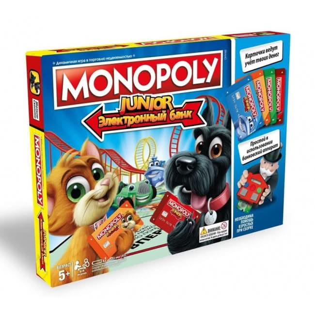 The Monopoly Junior Electronic Banking game presents a modern banking experience for kids in which Monopoly money is replaced by an electronic banking unit and Monopoly game bank cards. Players can use the cards to buy property, pay rent, and collect money when they pass Go. The game comes with 4 favorite tokens: Little Hazel, Little Scottie, Toy Car, and Toy Boat. Players move their tokens around the board, buying the properties they love such as the ice cream parlor, the toy store, and the skate park. It's so much fun for kids to make transactions using bank cards and placing "sold" signs on their very own properties. The player with the most money wins the game.