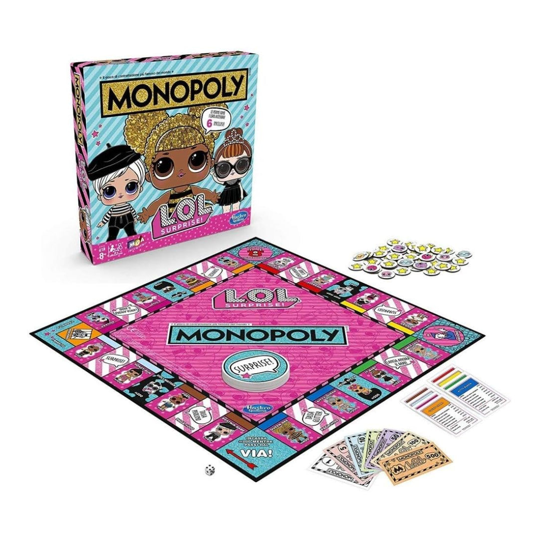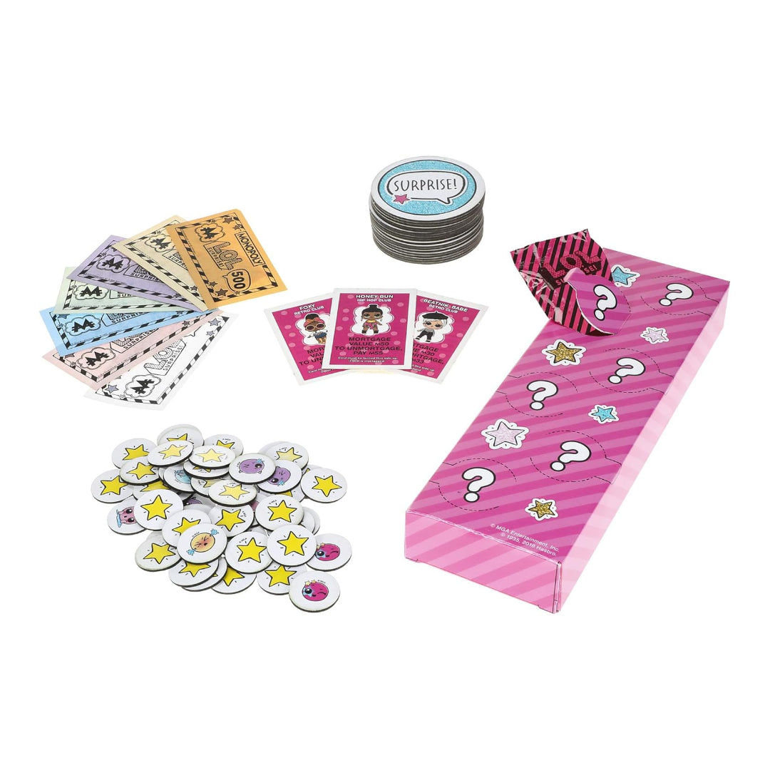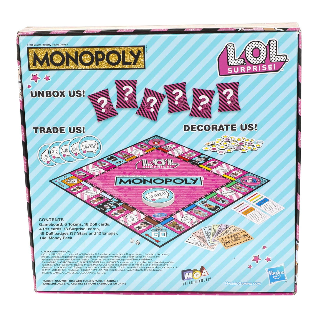 "The Monopoly game meets the super-cute L.O.L. Surprise! Instead of locations and properties, in this Monopoly: L.O.L. Surprise! Edition game players buy, sell, and swap other players' Dolls shown on the game board, aiming to collect the rare ones. Surprise! Cards replace chance cards, stars and Emoji replace houses and hotels, and the tokens are authentic L.O.L. Surprise! Doll accessories. Players are offered an exciting surprise experience when they unwrap the tokens. What a great gift idea for L.O.L. Surprise! Fans as well as Monopoly fans. For kids ages 8 and up.