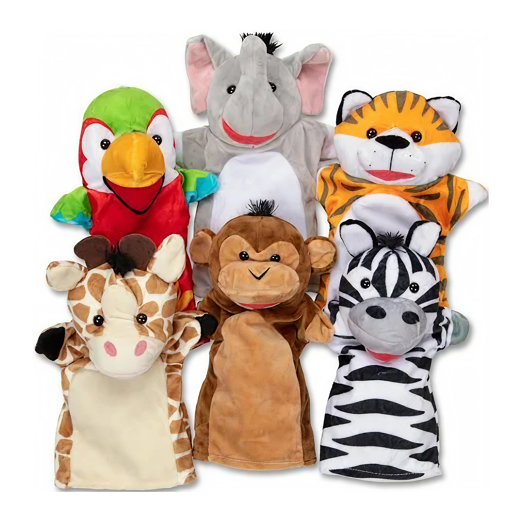 Set of 6 soft and cuddly safari animal hand puppets. - Includes elephant, tiger, parrot, giraffe, monkey and zebra. - Great for telling stories. - Helps develop motor skills, practice vocabulary, express feelings, and build confidence. - Approximate dimensions: 36.2 x 24.1 x 4.4 cm. - Suitable age group: From 2 years old and above.