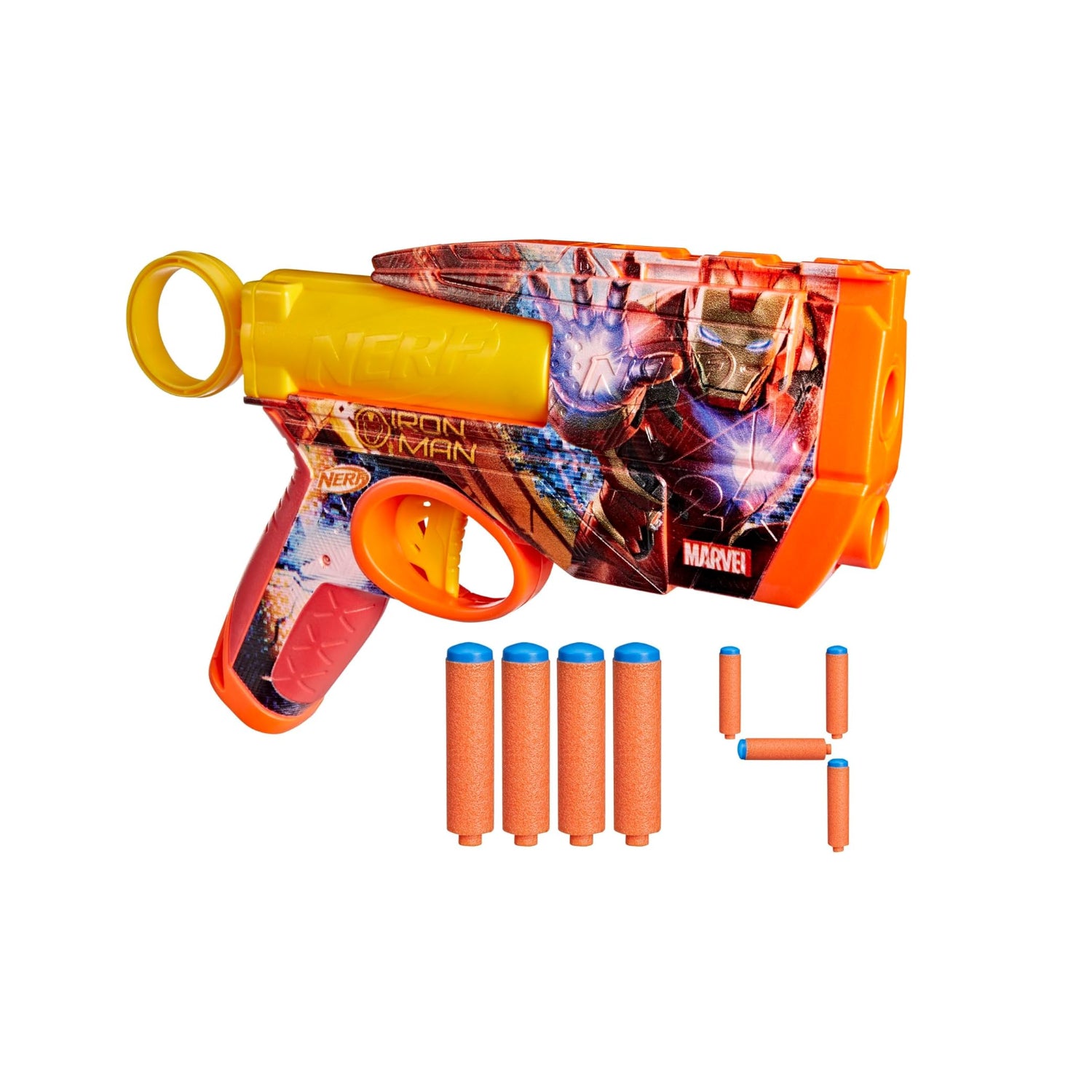 - NERF MARVEL IRON MAN BLASTER: Armor up with this Nerf dart blaster featuring dynamic Iron Man designs on both sides!