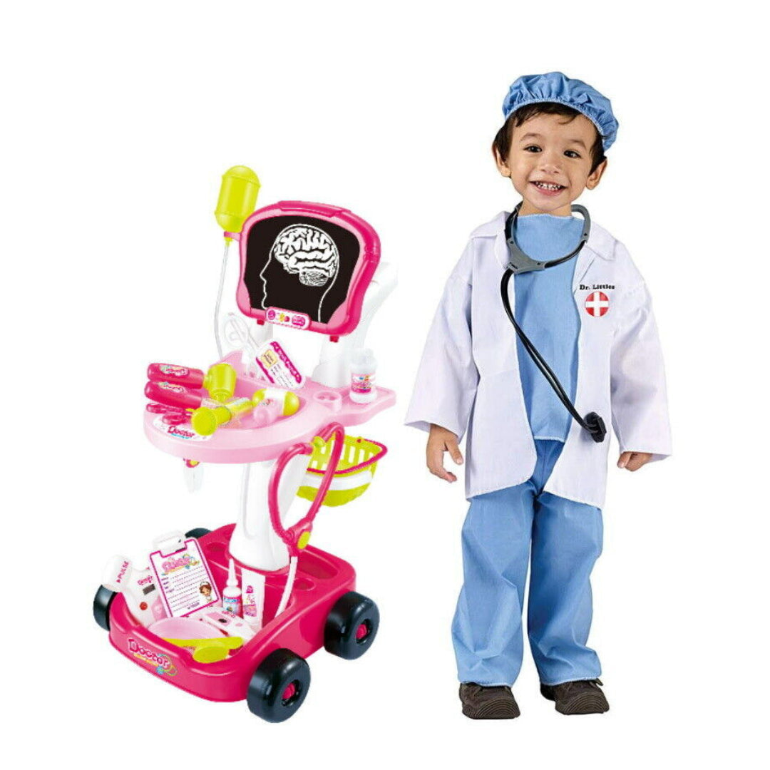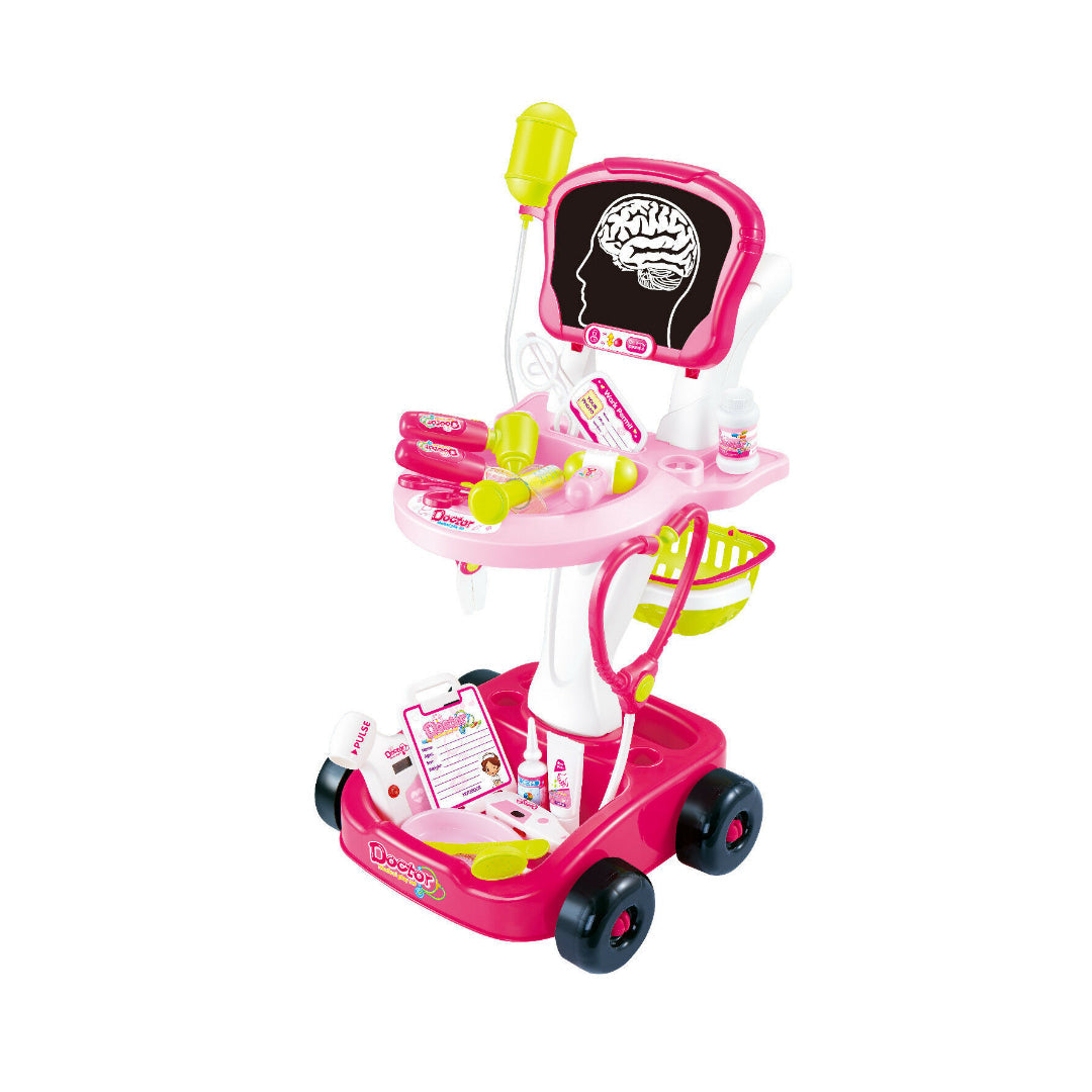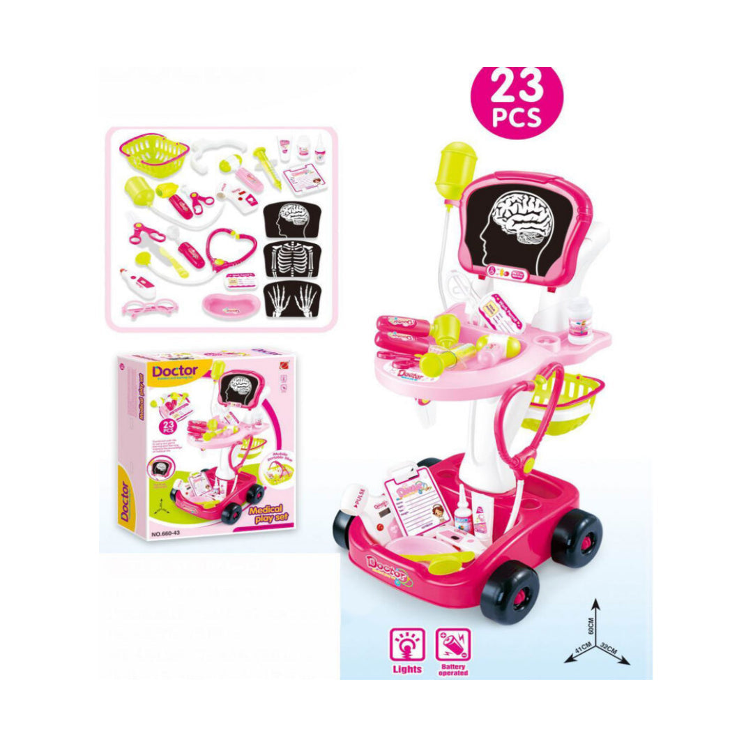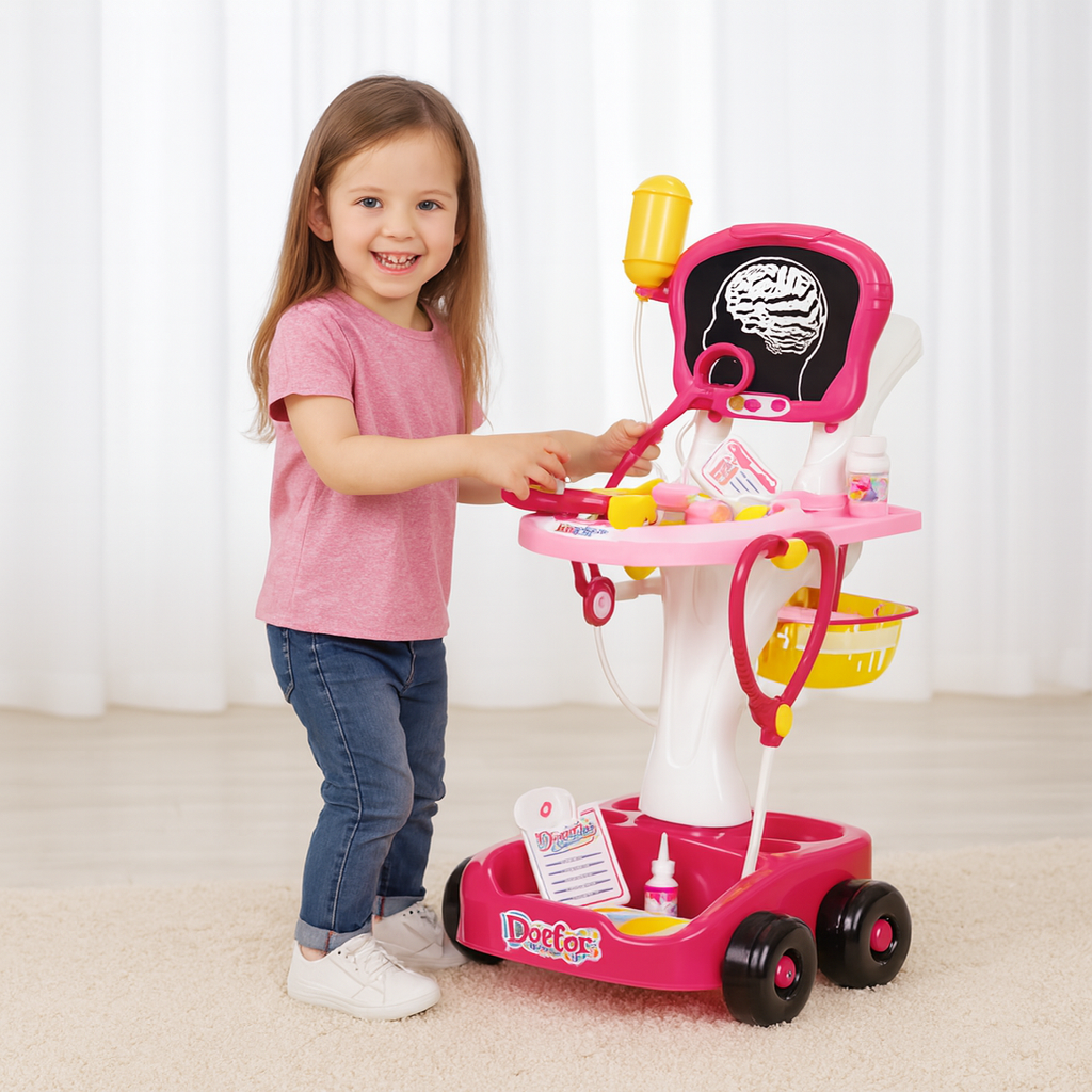 This wonderful medical play set can be easily wheeled around and is the perfect size for your little doctor or nurse of the future. This durable and colourful play set comes with over 20 medical accessories including a thermometer, Otoscope, patient record board, and a battery-operated stethoscope with lights and sounds. A proven way to encourage creative and imaginative role-play sessions and help children understand the process of going to see the Doctor. This type of toy promotes social and language skills as children talk to their patients, discussing their health.