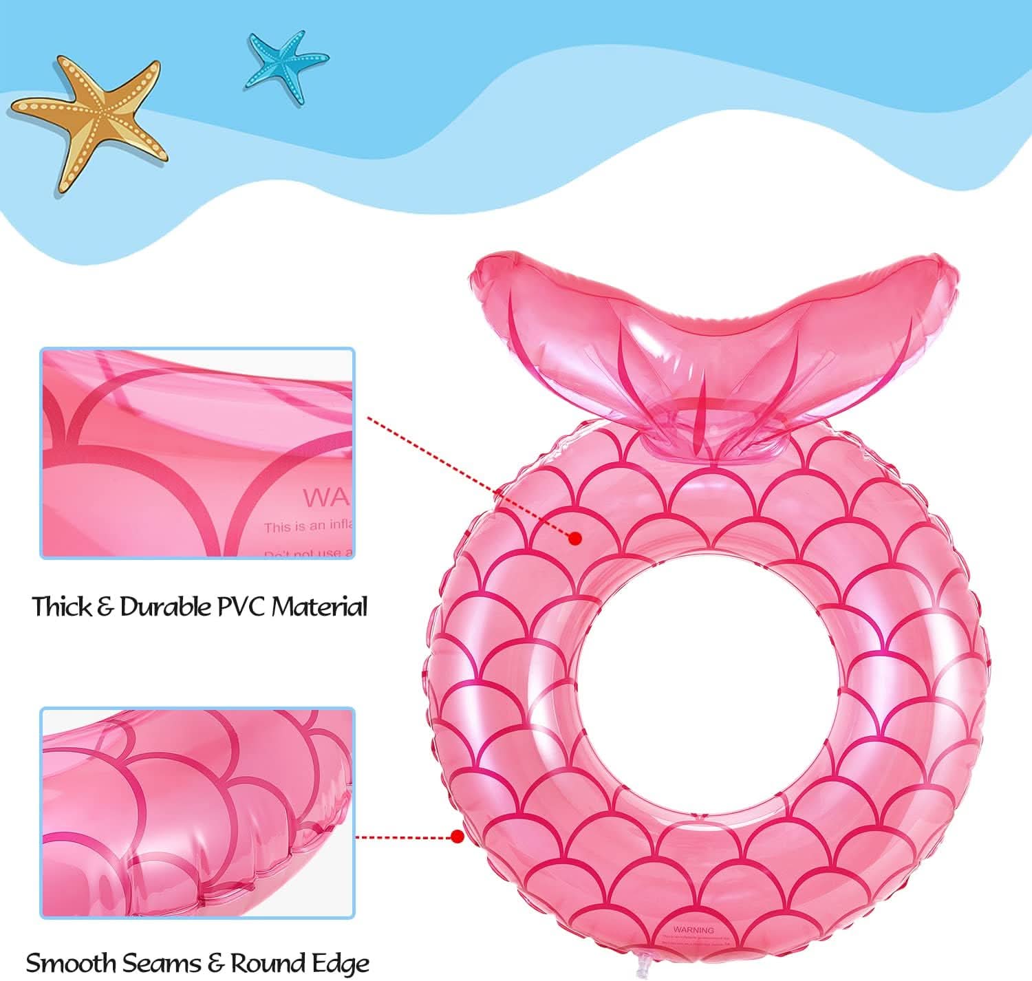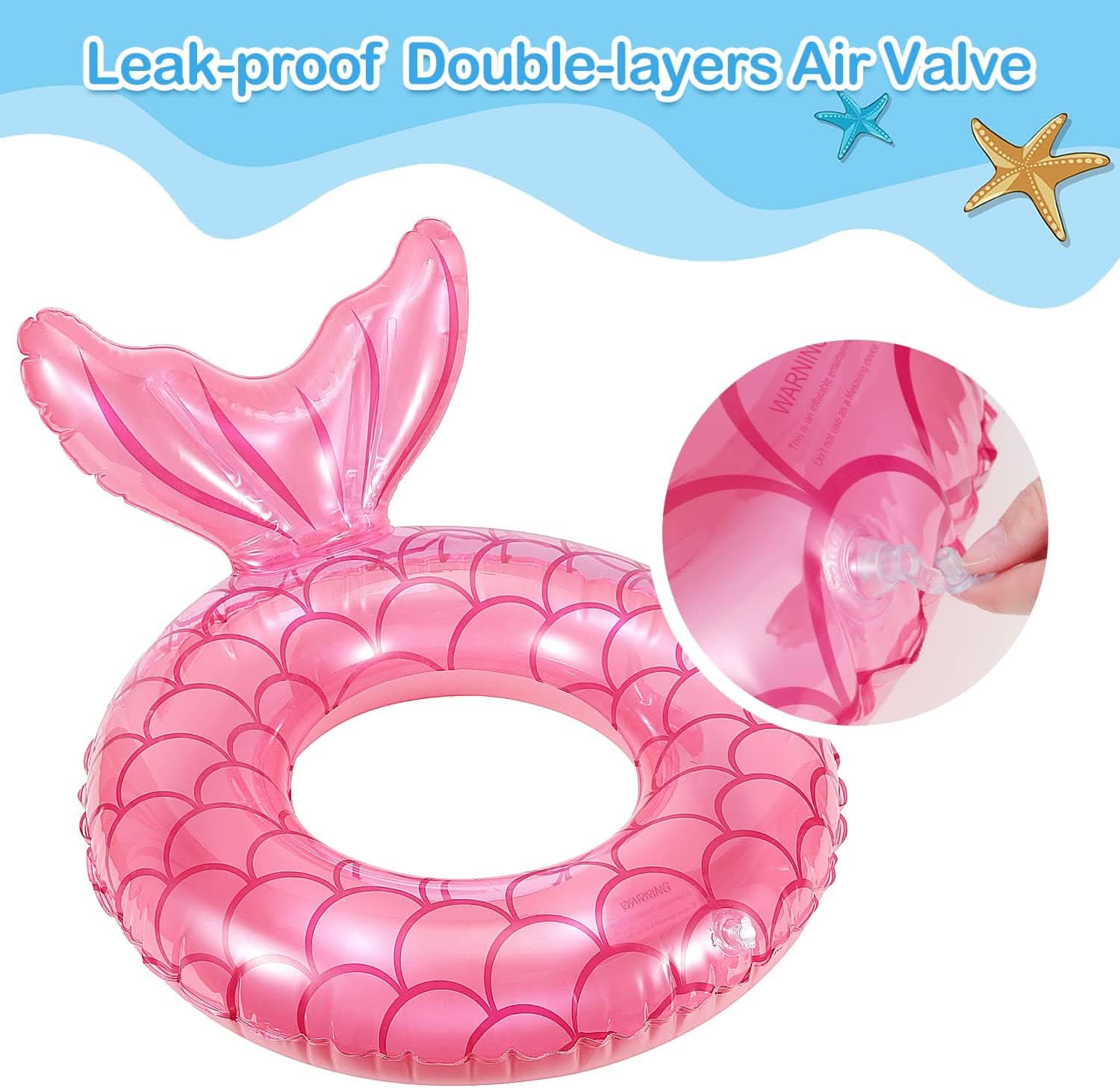 This mermaid shaped pool float is a must-have companion for summer. With its distinctive mermaid design, it will make you look beautiful and enjoy your summer time. It will be your favorite to take to the beach, the river, and your next pool party. Print Stamp Design & Good Sealing Color printed appearance, balloon design increases buoyancy and maintains better balance between children and adults in the water. And the work at the joint is also very fine, to keep the seal, to ensure safety. Eye-catching color and special design set a summery feel in this swimming tubes mermaid tail which will make a big splash in the scorching summer days, and bring a super fantastic swimming experience for you and your little ones. With high-quality PVC material & vivid appearance, both Kids & Adults will surely love it and play happily in the swimming and splashing paradise. Our pool tube is secured with hidden air nozzle from both inner and outer sides, to prevent water leakage and ensures easy air inflation, be at ease and enjoy water playing time.