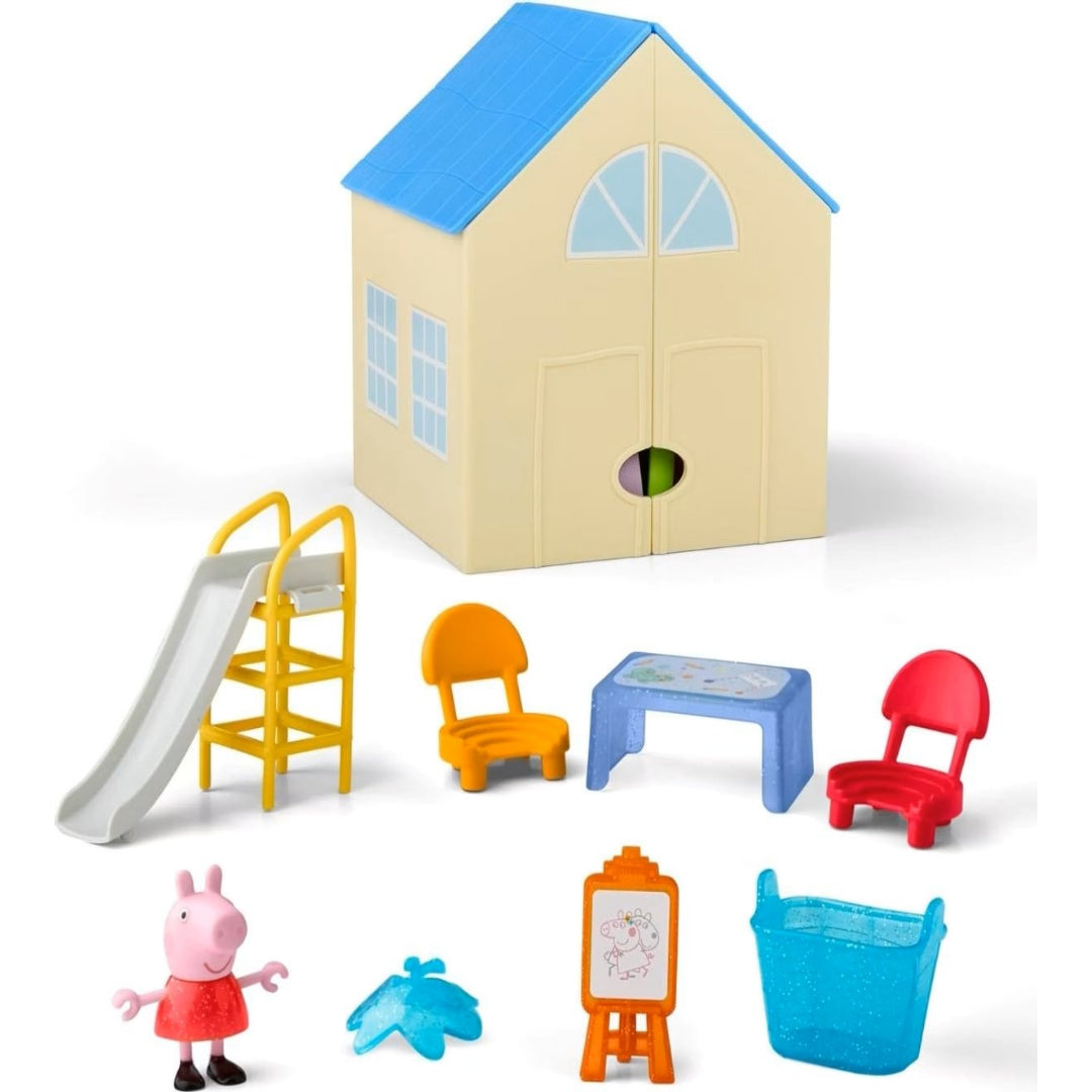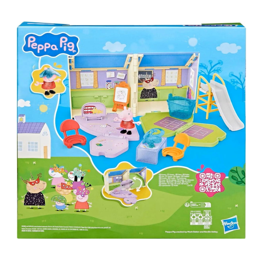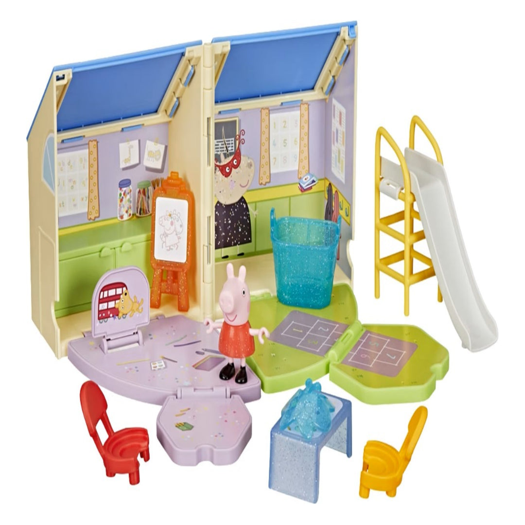 The Peppa Pig foldable playgroup playset invites children to invent imaginative preschool stories! Kids can open and unfold the schoolhouse to reveal a classroom and playground, and then arrange the accessories as they wish. Is art on the agenda? Here, the Peppa Pig figure can be shown using the easel or sitting on a chair at the art table. What has Peppa crafted? It's a sparkling butterfly mask! The Peppa figure can wear the mask accessory while playing, encouraging children to reenact their favorite moments from the series. Time for a break! Play hopscotch or slide down the slide? (Both!) This Peppa Pig toy set will delight all Peppa fans who love Peppa Pig figures and playsets with its many play possibilities. A great gift for children aged 3 and up.
