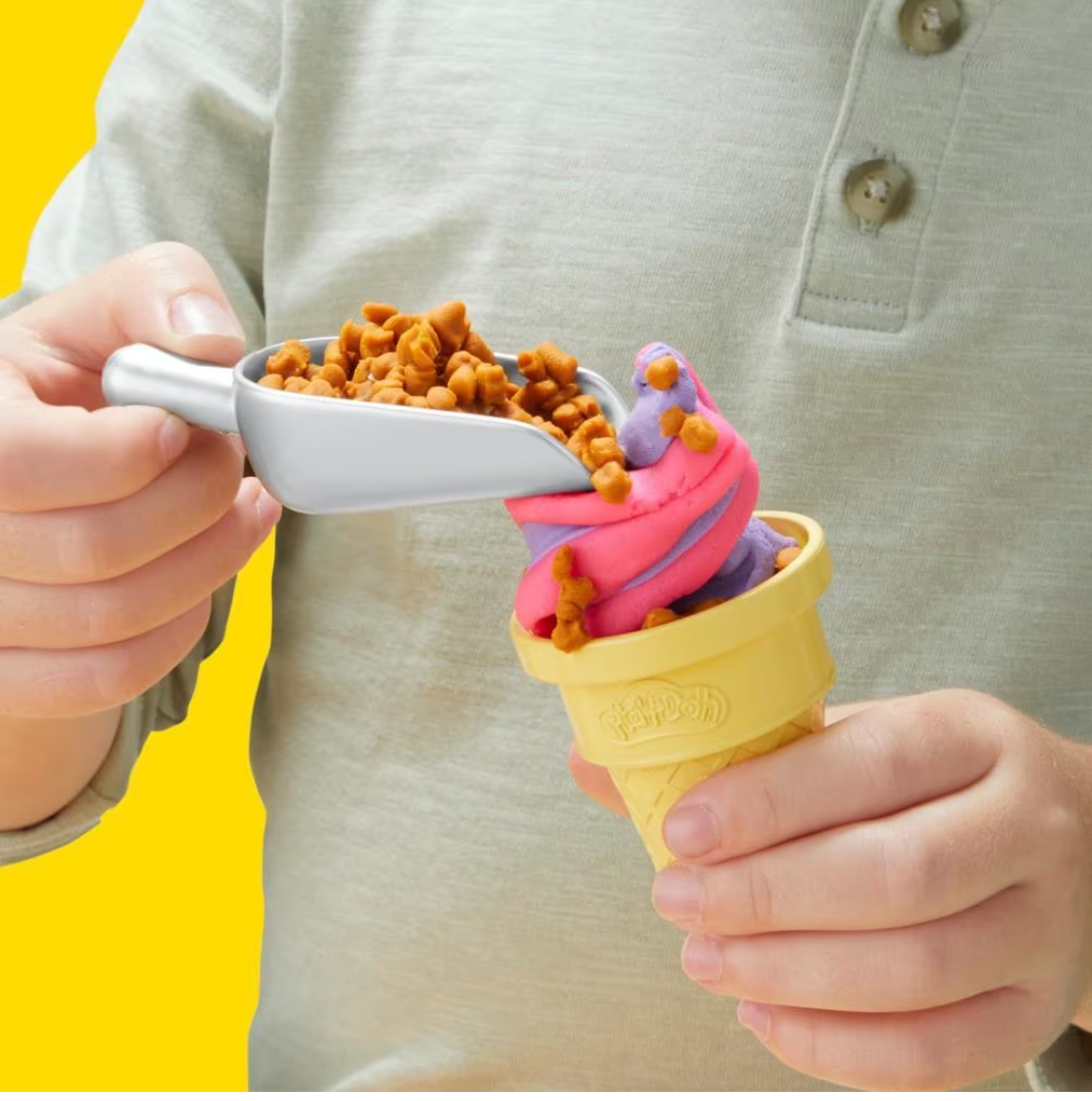 Twirl into imaginative play with the Play-Doh Rainbow Swirl Ice Cream Playset! Load the machine with 2 or more Play-Doh colors and press the handle to fill the spinning cup or cone with rainbow-edged pretend soft-serve. Create make-believe sprinkles and other Play-Doh food like pretend pretzels, fanciful fruits, and crazy candy cups to decorate creations. This toy ice cream set comes with a spoon, a toy knife, a sprinkle scoop, a dish, a cone, and a cup with a cover, so kids can play pretend ice cream shop and imagine serving up their Play-Doh creations. This Play-Doh kit includes 10 ounces (284 g) of Play-Doh modeling compound, including 3 dual-color cans to make multicolor swirls and decorations. Toy kitchen appliances like this Play-Doh kitchen set for kids make great gifts for 3 year old girls and boys and up.