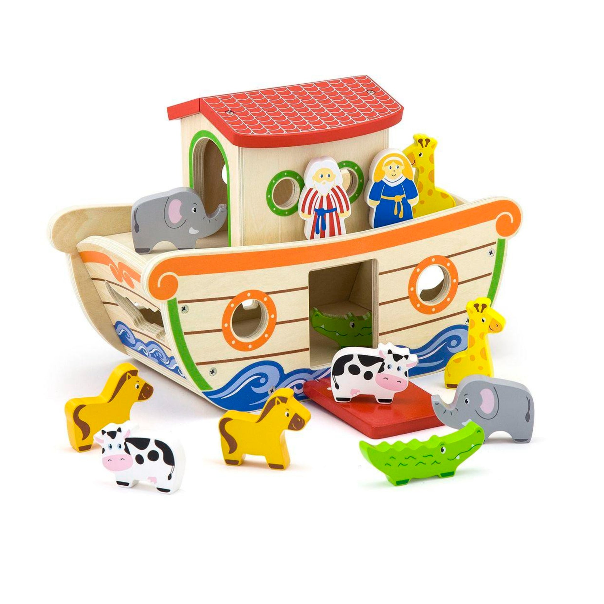 The flood is coming, and Noah is going to save the animals two by two. Includes Noah, his wife, the ark and 14 chunky animals (2 lions, 1 cow and 1 bull, 2 cats, 2 horses, 2 giraffes and 2 gulls). With magnetic pins, the gulls can “fly” on the roof. Tell the story of Noah’s Ark and watch children fit the pieces into the right shape sorter holes.