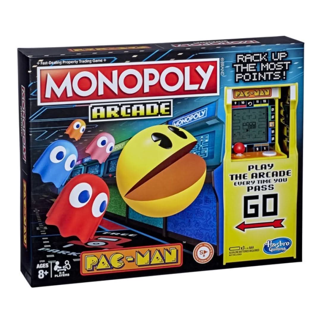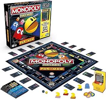 Gamers and fans of the pair-man can relive some of their gaming experiences with this pair-man themed MONOPOLY game. In the MONOPOLY arcade pair-man board game players can play pair-man on the retro banking and arcade unit and can also use it to buy, sell, or steal levels and perform various other actions. Players race around the board (but watch out for the ghost!) to buy levels and earn points. Each time A player passes go they get to play a mini game of pair-man. Rack up the points while everything is tracked in the banking and arcade unit, with no money changing hands. The player with the most points wins! Licensed by band a I namco entertainment America Inc. The Hasbro, Hasbro gaming, parker brothers, and MONOPOLY names and logos, the distinctive design of the game board, The four corner squares, the Mr. MONOPOLY name and character, as well as each of the distinctive elements of the board and playing pieces are trademarks of Hasbro for its property trading game and game equipment.