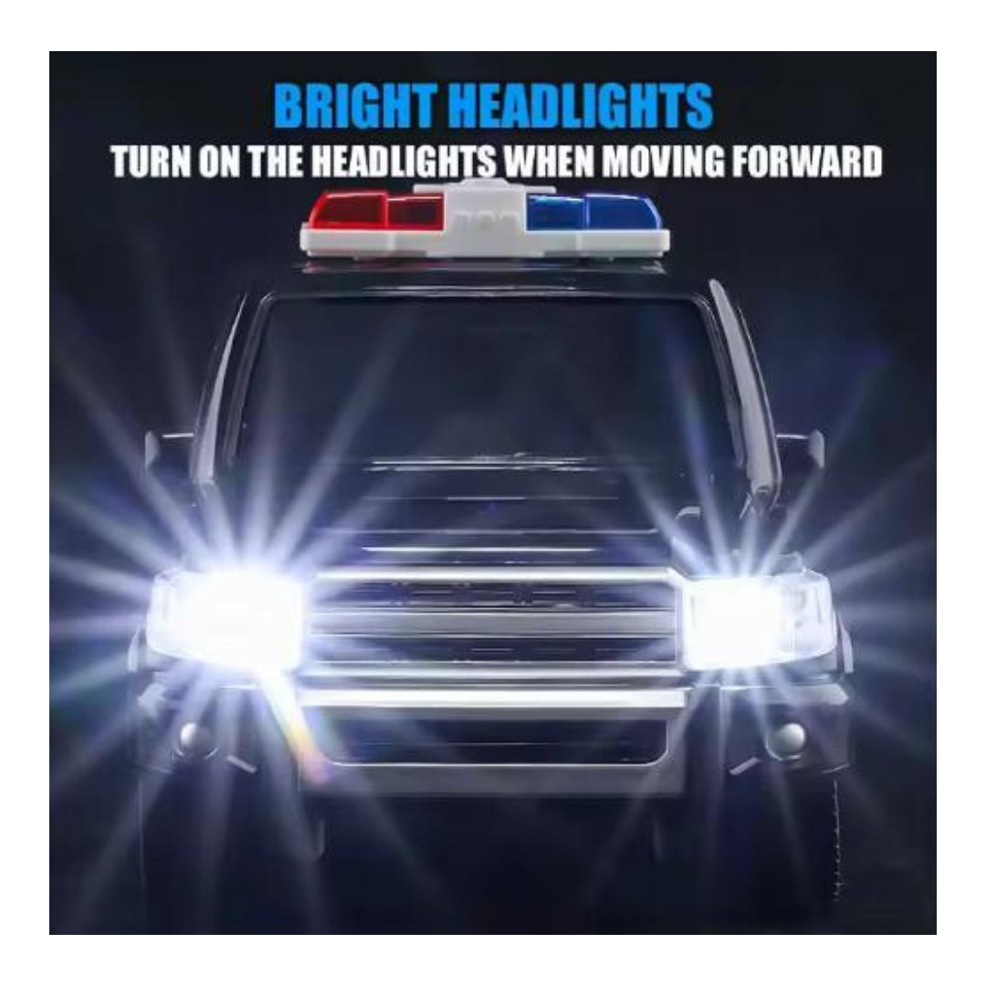 This RC Police SUV is a sleek, realistic-looking remote control toy car designed to mimic a modern black-and-white police vehicle. It features a sturdy body, police-themed decals, and working LED headlights for an engaging play experience.