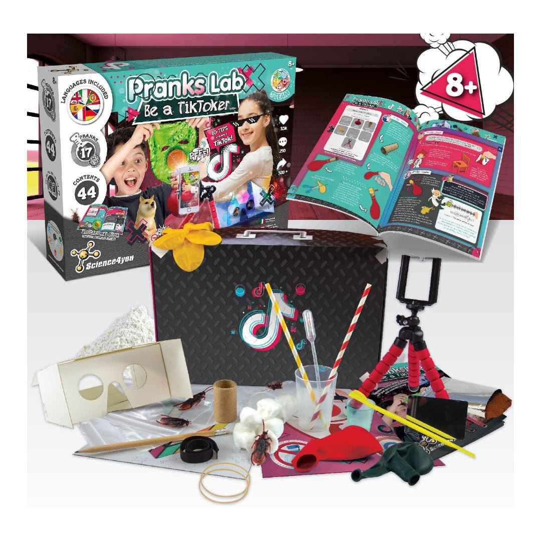 "Become a TikTok prank master and fool your friends and family with scientific tricks! Create fun whoopee cushion and catch your friends on video. Fool your friends with crazy glasses that will distort their reality. The Brain Activator stamp means this set helps to develop important skills like concentration, memory or creativity while playing. Includes 17 experiments with apparatus and a 36-page educational booklet.