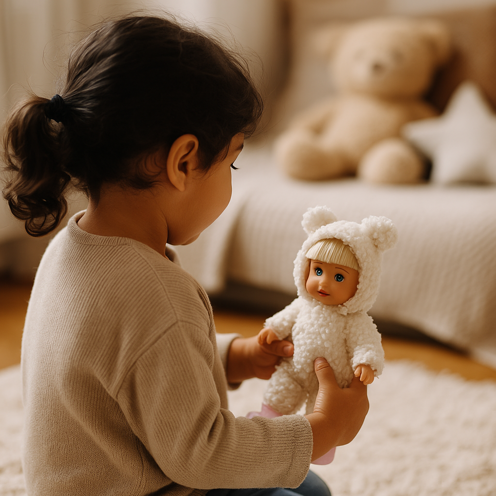 Evi is Steffi love's cute little sister. Just like Steffi, Evi has beautiful long hair, countless hobbies, loves animals and is perfectly dressed for every occasion. The 12cm tall Evi doll wears a one-piece with teddy fur look and teddy ears, which is available in the cream or burgundy. Evi's blonde hair is cut to a bob with bangs and fits and rounds off her stylish look. Evi love cute teddy is a true cuddly dream and a loyal playmate that children will immediately take to their hearts.
